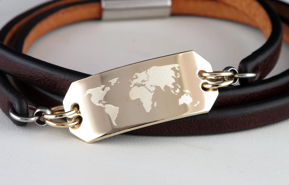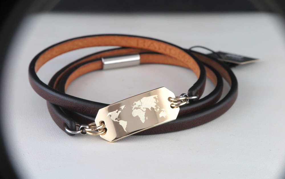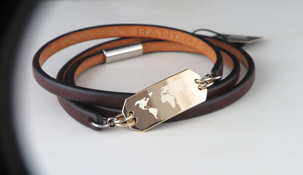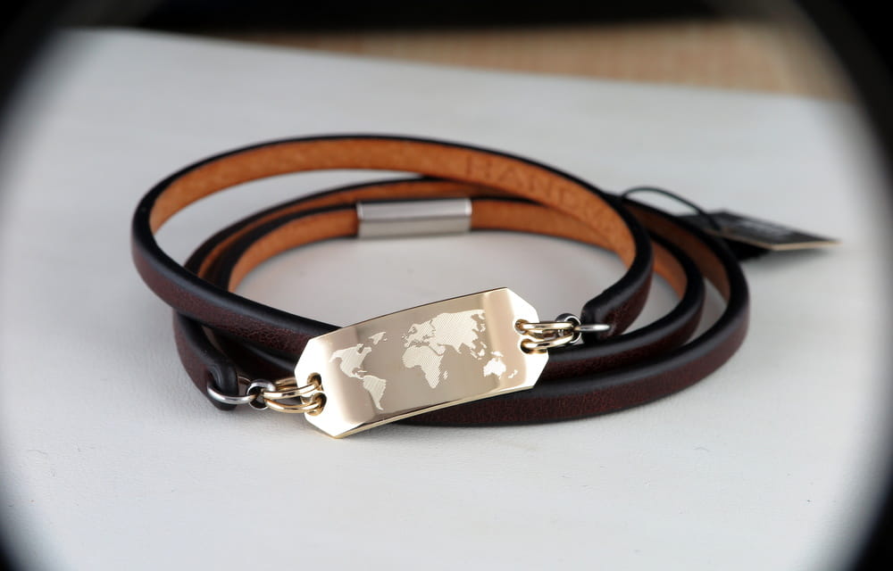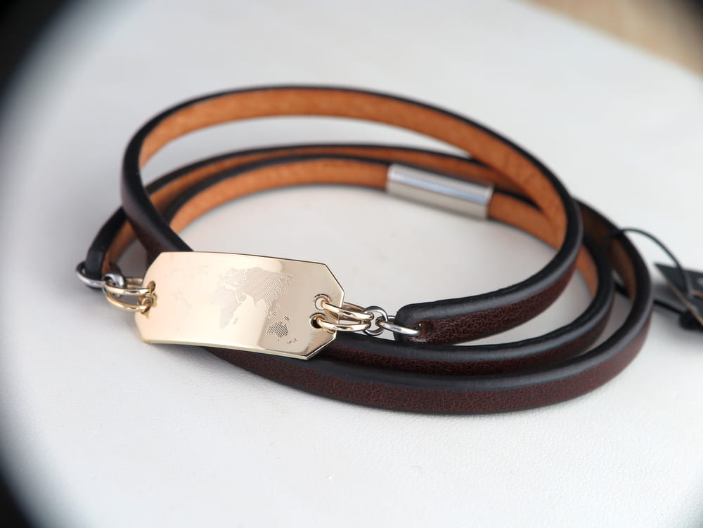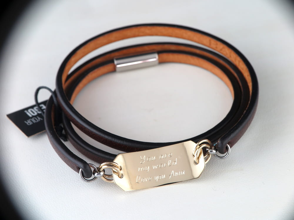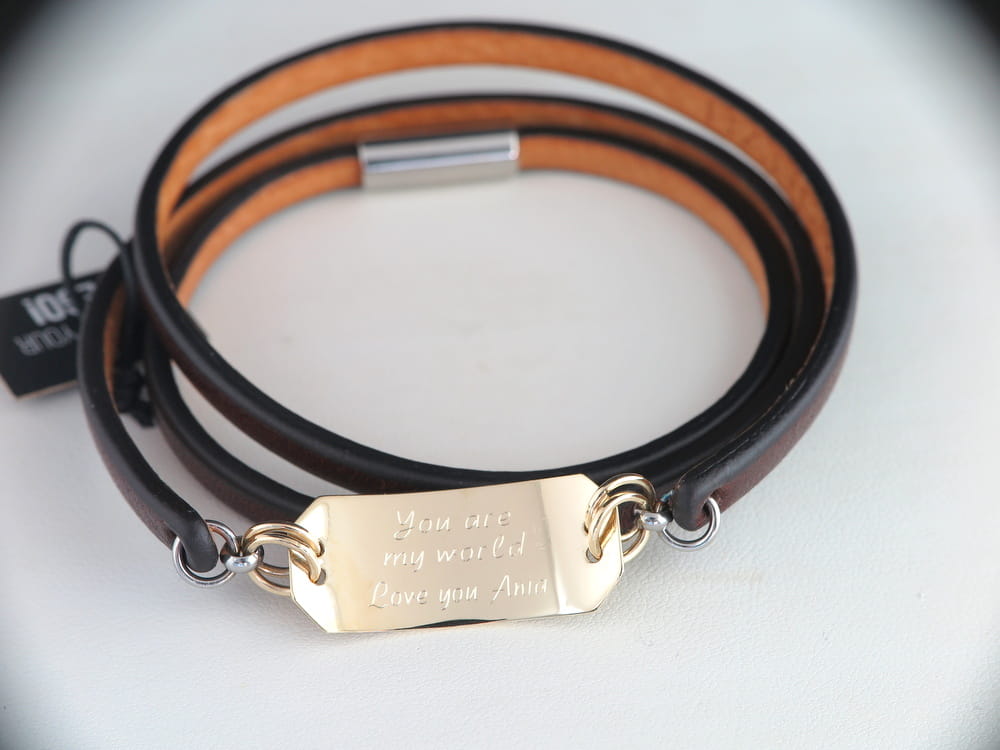 Dla naszej stałej klientki wykonaliśmy tym razem blaszkę z grawerunkiem, którą zamontowliśmy na stałe do przesłanej skórzanej bransoletki. Wspólnie wymyśliliśmy kilka wariantów, zarówno co do kształtu i jak i sposobu wykonania elementu i treści samego grawerunku. Ostatecznie klientka zdecydowała się na całość w żółtym złocie z grawerunkiem na powierzchni. Wymiary zawieszki to około 30 x 12 mm i grubość około 0,80 mm. Aby blaszka lepiej się układała na nadgarstku została lekko wygięta. Cały wykonany przez nas element jest ze złota pr. 585.