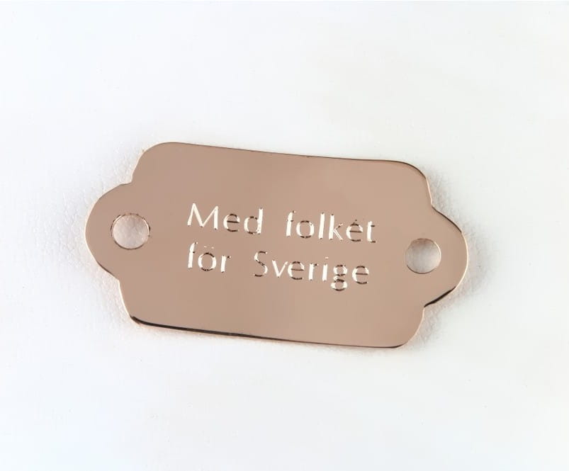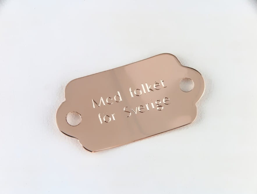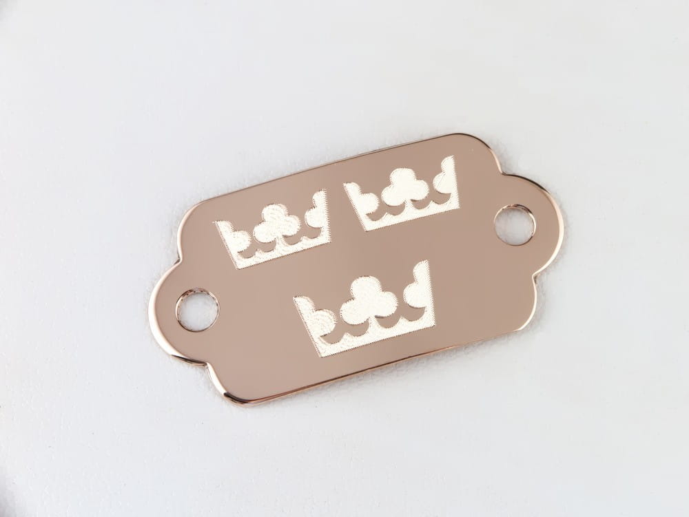 Na życzenie klientki wykonaliśmy ozdobny element, który posłuży do stworzenia bardzo osobistego prezentu. Blaszka z różowego złota o próbie 585, wykonana została z arkusza o znaczącej grubości 0,55. Wybór takiego materiału zapewni trwałość oraz sztywność przedmiotu na długie lata. Delikatny półokrągły profil pozwoli swobodnie i wygonie nosić blaszkę na nadgarstku a okrągłe wypolerowane otwory pozwolą na zamocowanie na sznurkowej czy skórzanej bransolecie. Całość wykończona jest na wysoki połysk, a grawerunek wykonany został diamentem. Dedykacja, jak i trzy korony mają bardzo osobisty charakter i są projektem klientki.