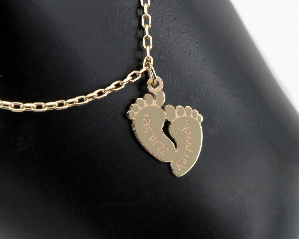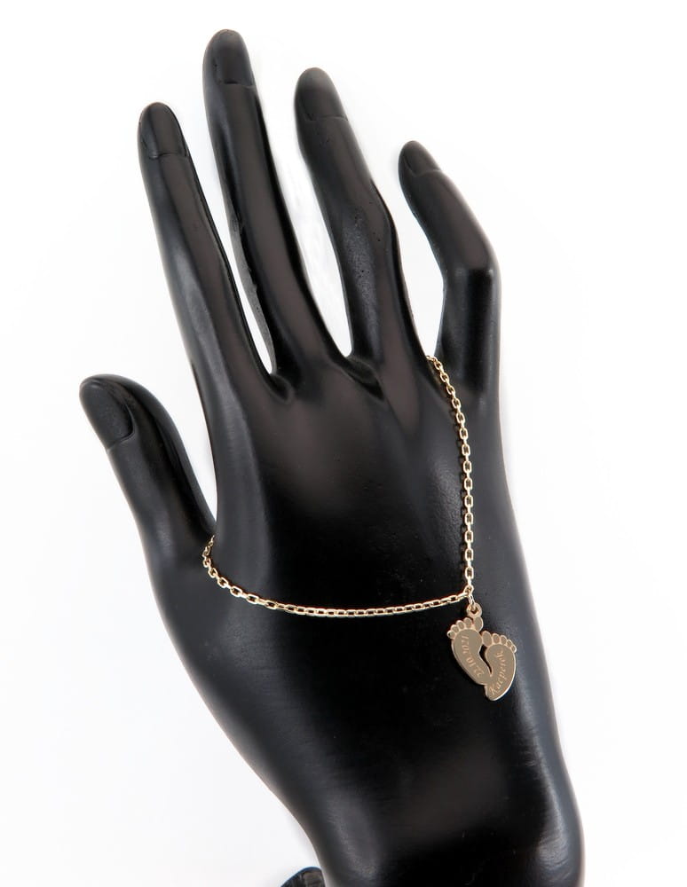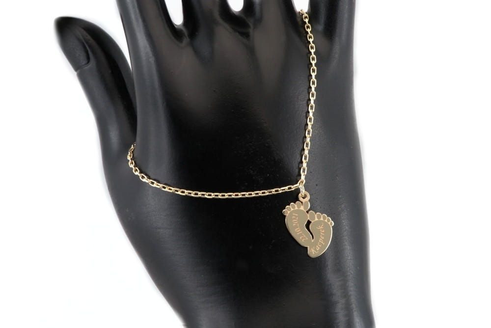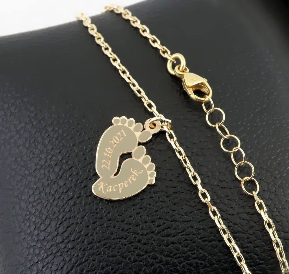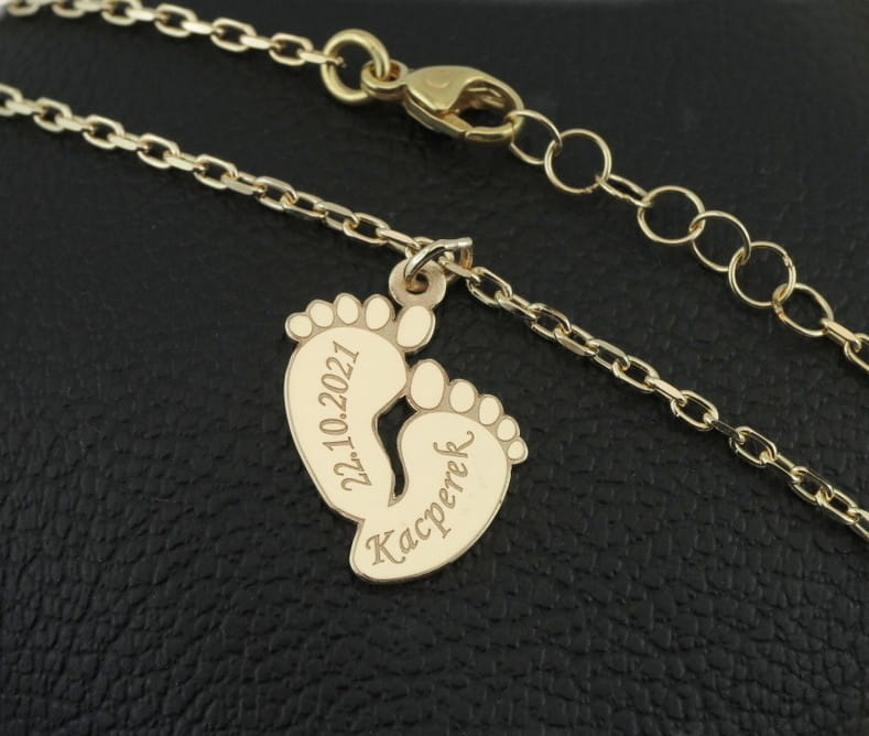 Nasz znajomy szukał bransoletki na prezent dla żony z okazji urodzenia i dziecka. Szukał czegoś wygodnegoi trwałego na czym można wygrawerować imię. Zaproponowaliśmy mocniejszy splot ankier na bransoletkę i zawieszkę w kształcie małych stópek, wyciętą z grubszego niż zwykle arkusza złota. W ten sposób komplet będzie można nosić na codzień bez obawy, że się zerwie przy pierwszym mocniejszym szarpnięciu. Wielkość zawieszki miała być jak zwykle nie za mała i nie za duża. Całość wykonana jest z żółtego złota pr. 585. Długość bransoletki dopasowana na nadgarstek młodej mamy , z dodatkową regulacją w postać łańcuszka zamocowaną na końcowym ogniwku. Na stópkach z przodu wygrawerowana została data i imię chłopca. Same stópki są grawerowane laserem i lekko wypukłe. Tył zawieszki jest wypolerowany.