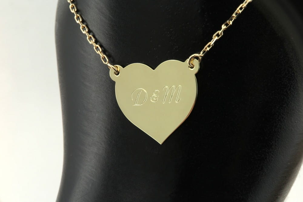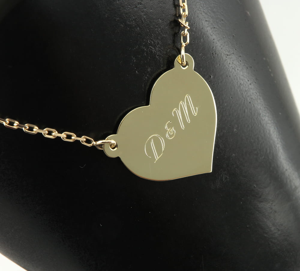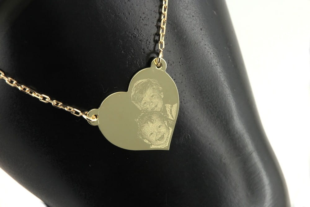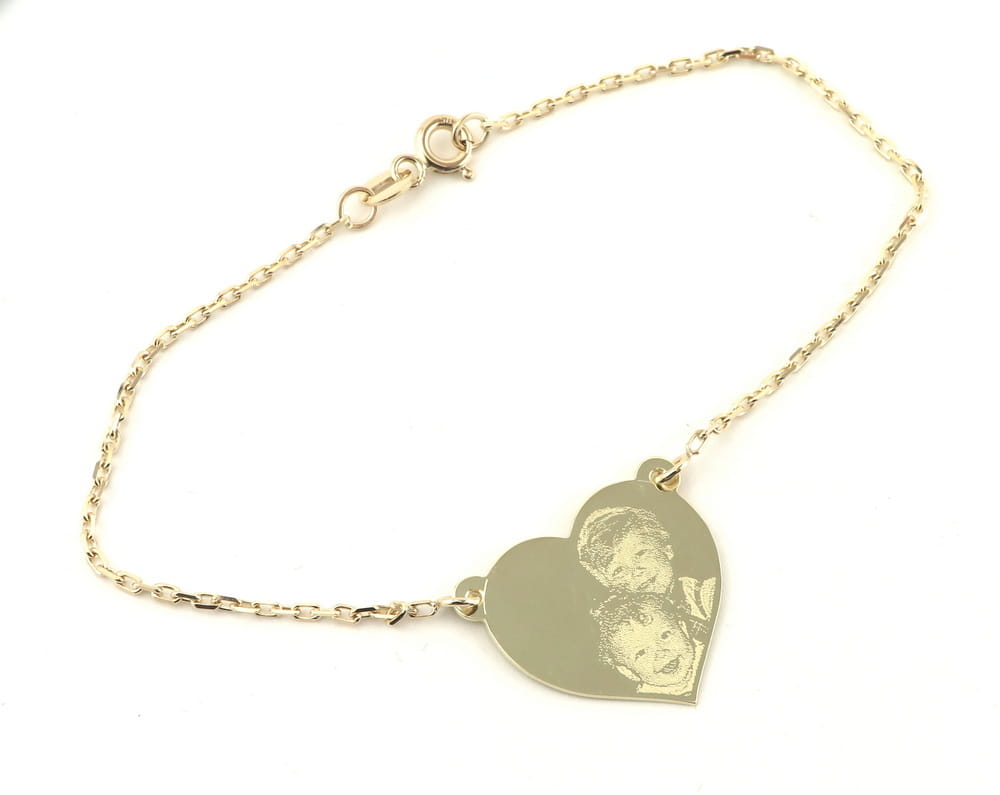 Na życzenie klienta wykonaliśmy spersonalizowana bransoletkę ze złotym serduszkiem. Na delikatnym łańcuszku w splocie brilantata zamontowaliśmy serduszko wielkości 21 × 18 mm. To ono jest głównym elementem bransoletki. Na froncie wygrawerowane zostały buzie dzieci, a tył ozdabia okolicznościowa dedykacja. Wyrób został wykonany z żółtego złota w próbie 585 i dopasowany do osobistych preferencji zamawiającego (wielkość serduszka, sposób mocowania, długość bransoletki). W podobnym stylu możemy wykonać również naszyjnik lub kolczyki do kompletu. Osoby zainteresowane prosimy o kontakt mailowy, celem przygotowania indywidualnego projektu. Koszt zależy od masy elementów (bransoletki i dodatków) oraz czasochłonności (indywidualne projektowanie, grawerowanie)