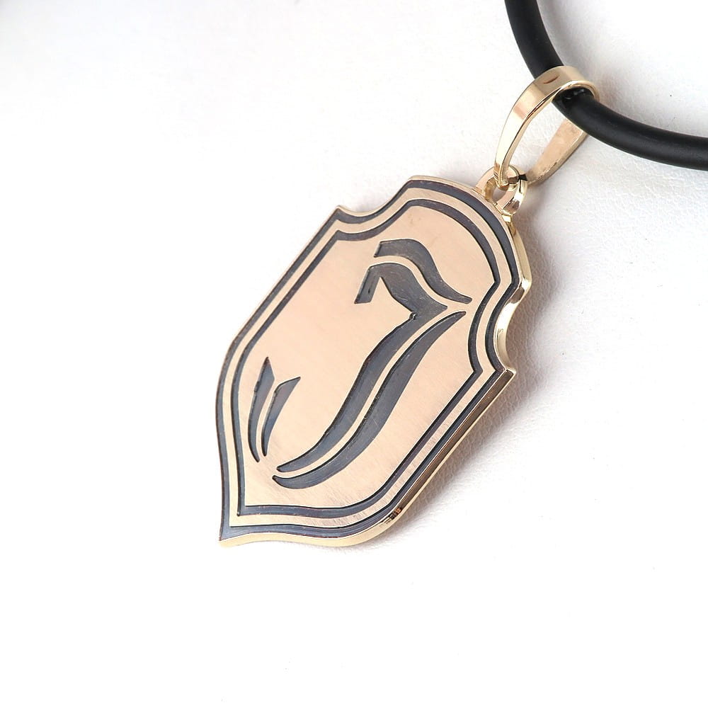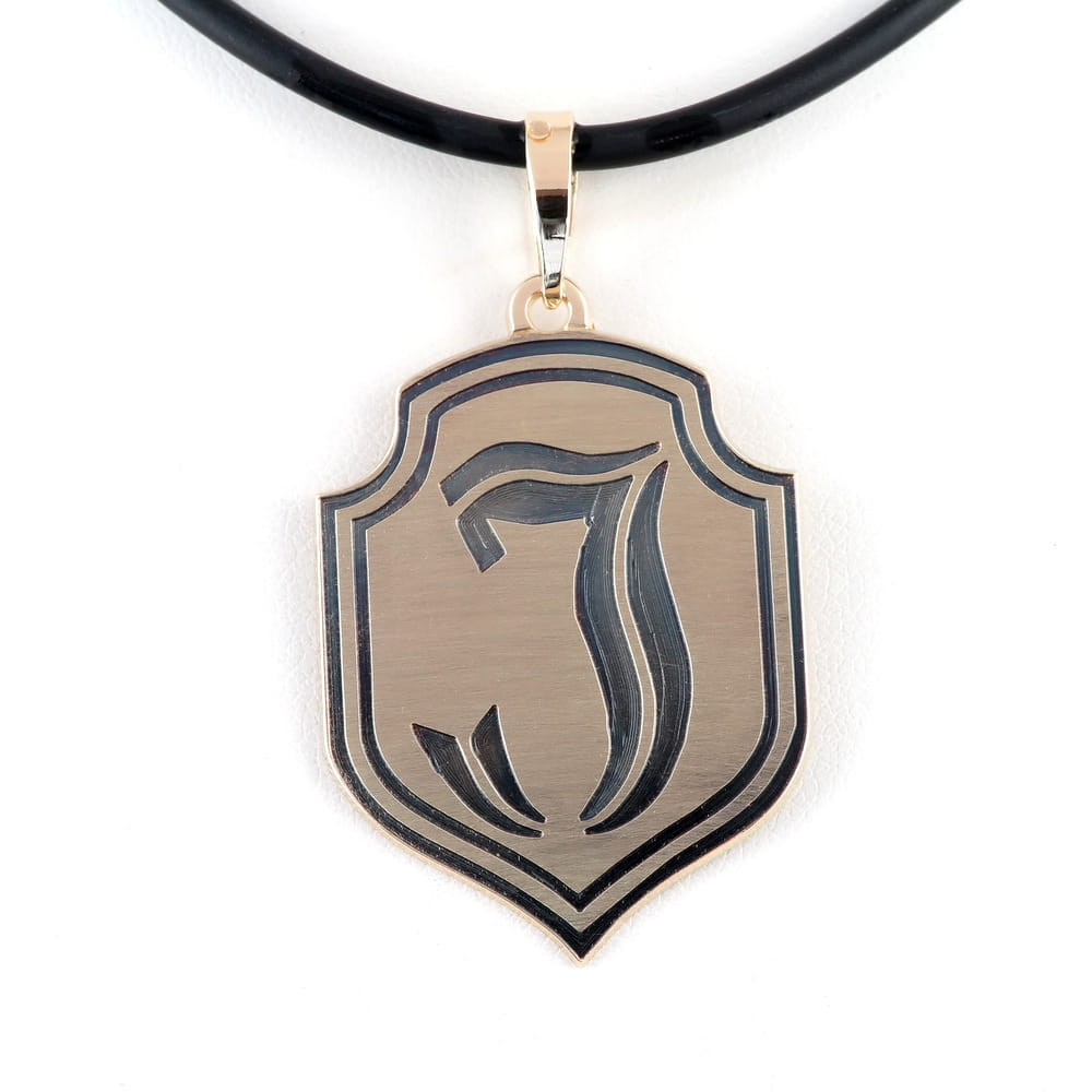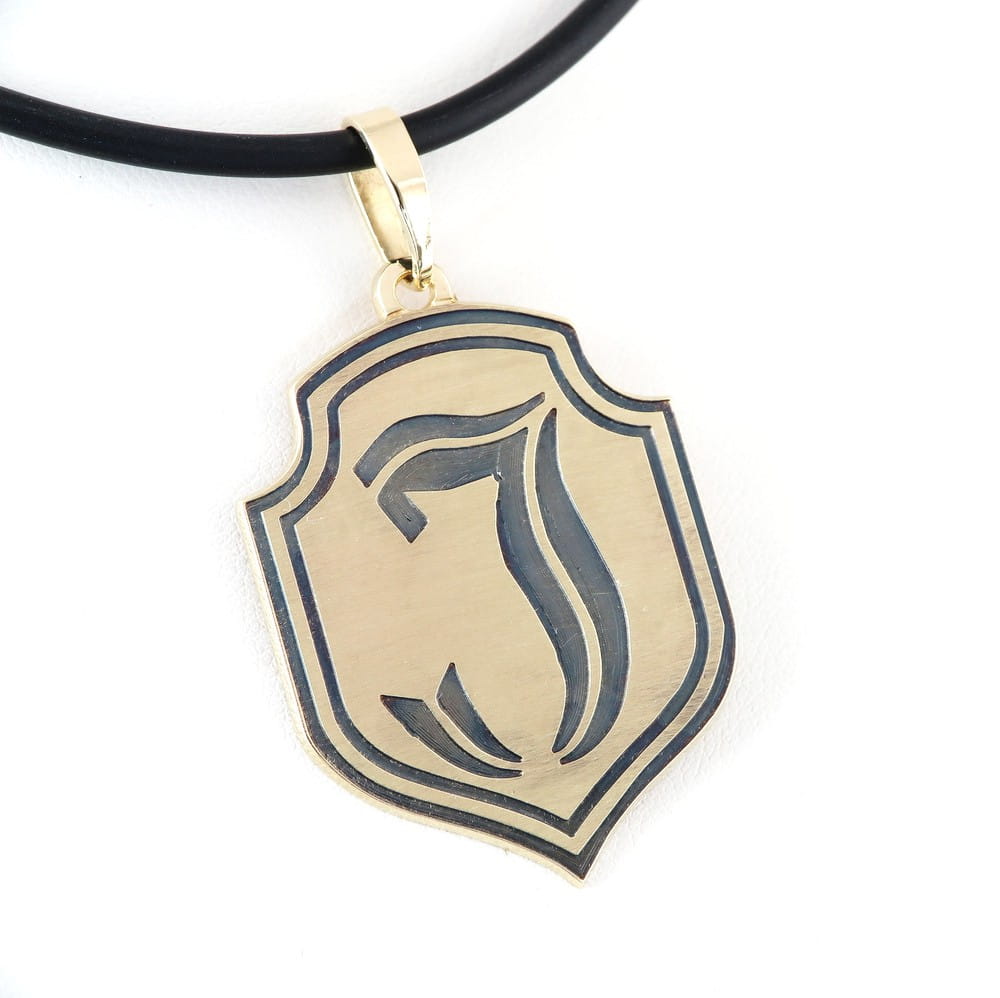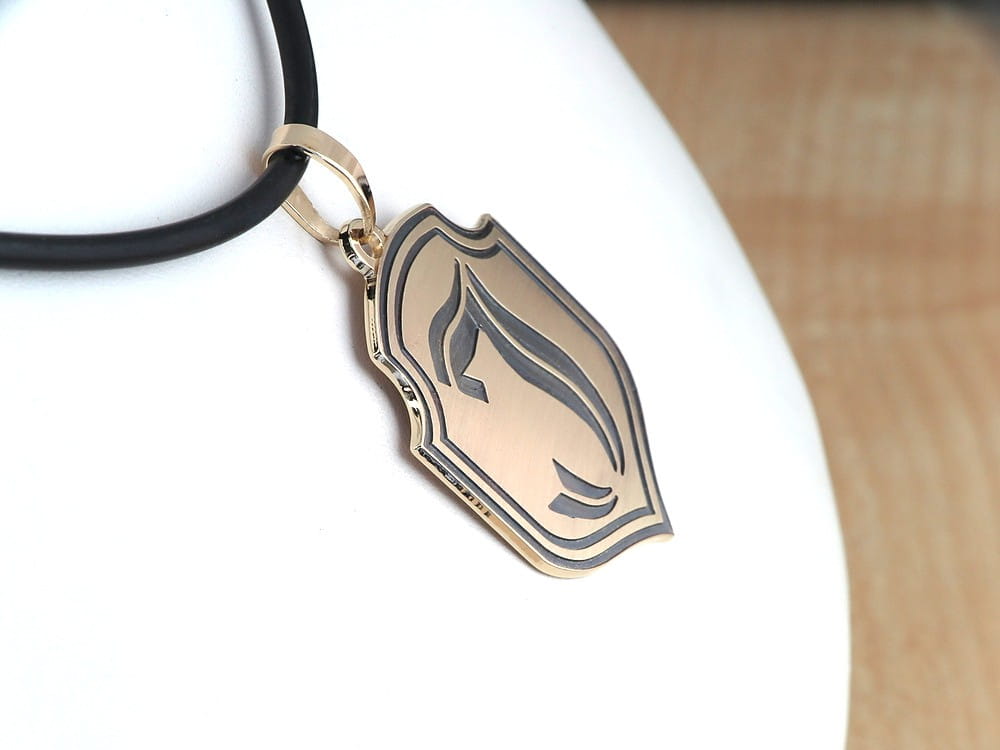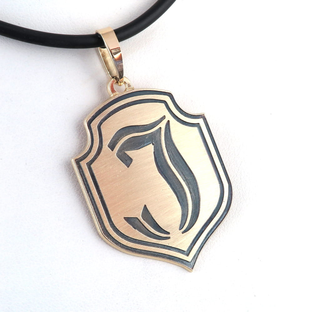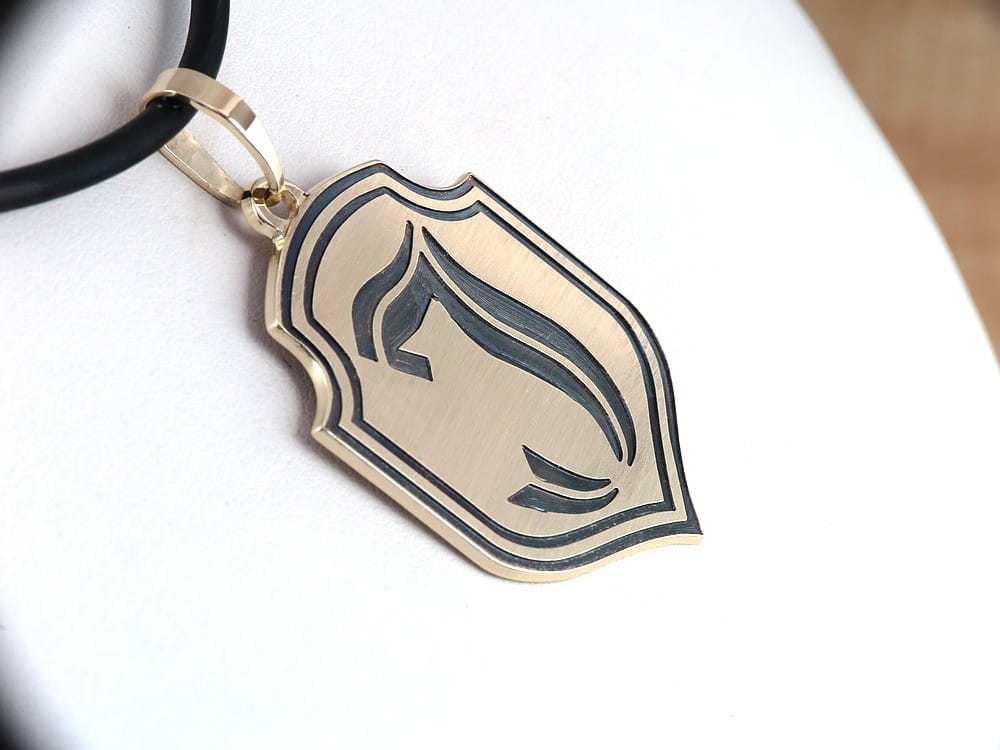 Zawieszka wykonana została na zamówienie klienta, w oparciu o rysunek herbu który przesłał jako wzór. Ustaliliśmy, że rysunek zostanie głęboko grawerowany i trwale przyczerniony. Front wykończyliśmy na satynowi, by zwiększyć jeszcze kontrast między ciemnym grawerunkiem a tłem. Wymiary samego herbu to 35 x 27mm. Całość wykonana została z arkusza złota grubości 1mm. Zlecenie zostało wykonane wg projektu klienta i widnieje na stronie tylko jako portfolio naszych prac, przestawiające sposób wykończnia zawieszki.