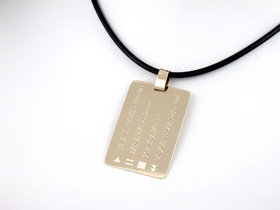 Duża prostokątna złota blaszka przygotowana pod grawerunek, który możesz z nami zaprojektować. Ten model wykonaliśmy dla klientki, tak dobierając rozmiary by treść do grawerunku zgrabnie się zmieściła. Przed wykonaniem przygotowaliśmy kilka wariantów do oceny.