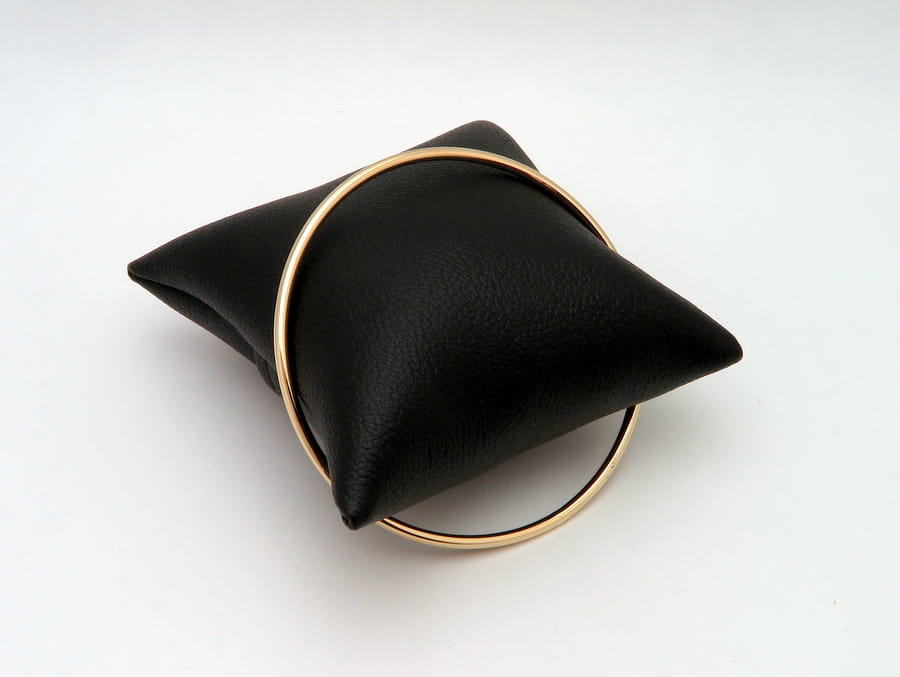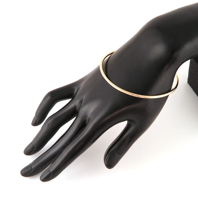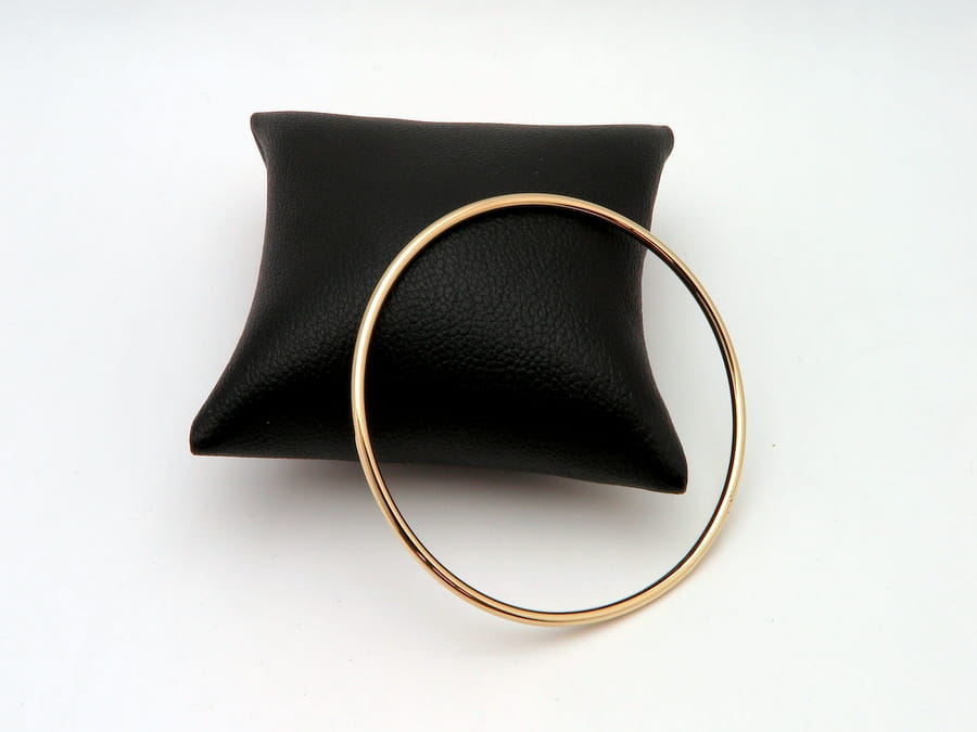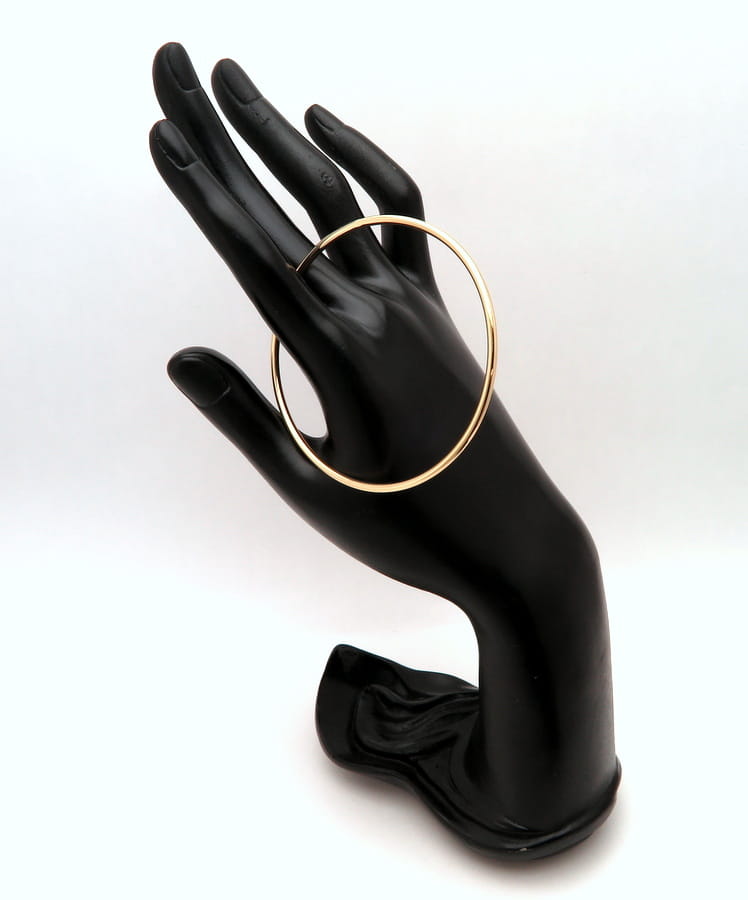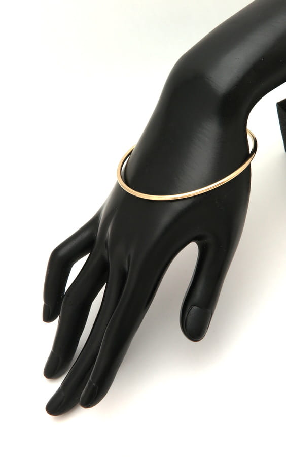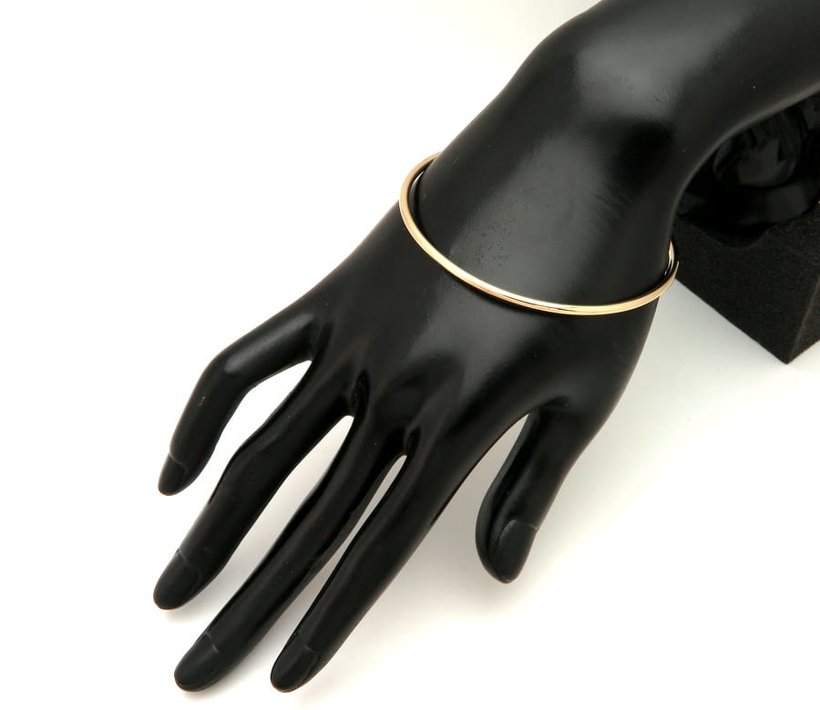 Na życzenie klientki, wykonaliśmy złotą sztywną bransoletę o masie 12 gram. Całość została wykonana z czternastokaratowego grubszego drutu, aby nadać bransolecie odpowiednią sztywność. Kształt idealnego koła uzyskaliśmy na okrągłej mandryli. Cały przedmiot został wypolerowany na wysoki połysk. Wielkość ustalana jest indywidualnie. Najłatwiej dopasować jest rozmiar do nadgarstka w naszej pracowni, za pomocą przygotowanych miarek dla bransolet.