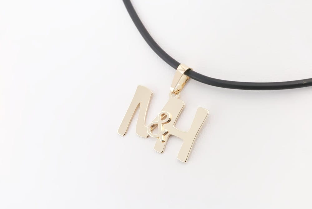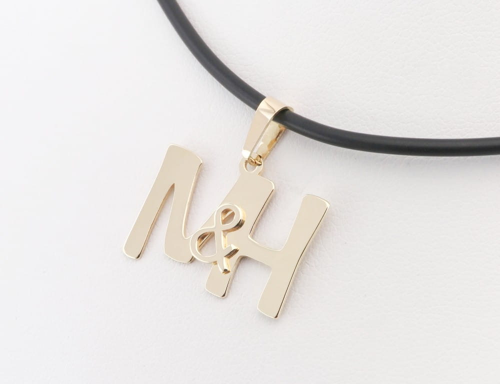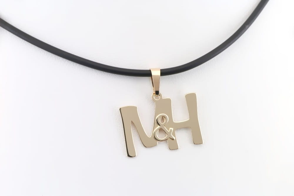Klienkta wysyłała do nas zapytanie o przygotowanie zawieszki na prezent. Spodobała się jej forma innej zawieszki z naszej strony, wykonana w srebrze i w podobnym stylu chciała wykonać zawieszkę z innymi inicjałami. Dopasowalimy kilka czcionek dających się połączyć tak by całość była czytelna, estetyczna i trwała. Wersję wybraną przez klientkę wykonaliśmy w żółtym złocie pr. 585. Wielkość i grubośc dobraliśmy tak by zmieścić się w określonej kwocie. Literki miały być grubsze ( wisior dedykowany dla mężczyzny ) więc aby zawieszka nie była zbyt szeroka postanowiliśmy połączyć ich pionowe kreski i na środku nałożyć mały znaczek &