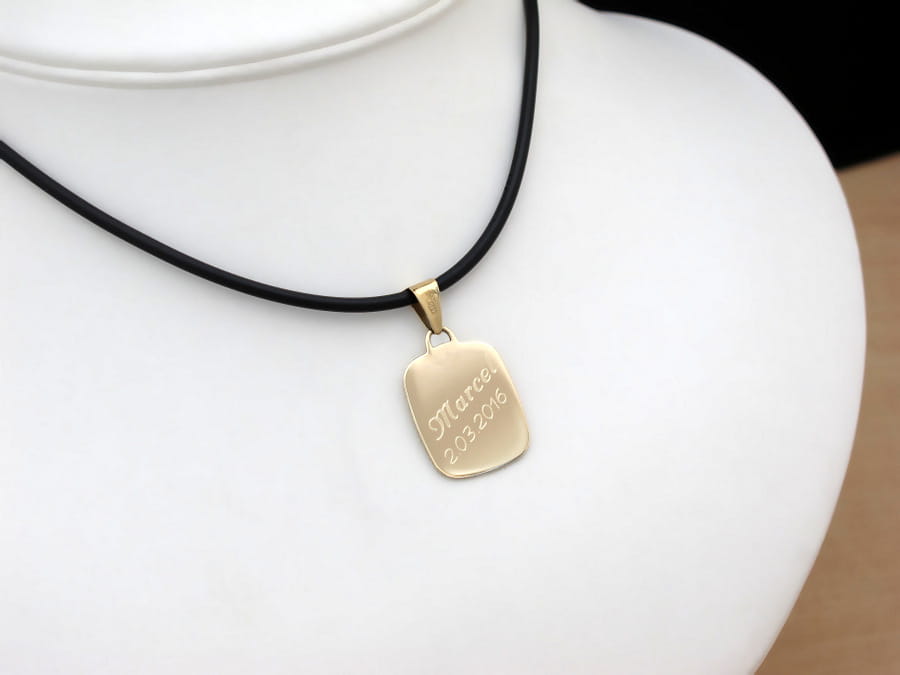 Złota zawieszka o lekko wypukłych krawędziach. Brak ostrych norożników nadaje lekkiego wyglądu. Taki kształt blaszki pasuje zarówno dla kobiety jak dla mężczyzny, który szuka zawieszki innej niż w typowy wojskowy nieśmiertelnik.