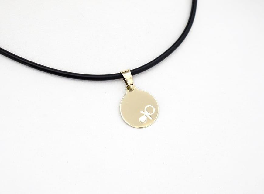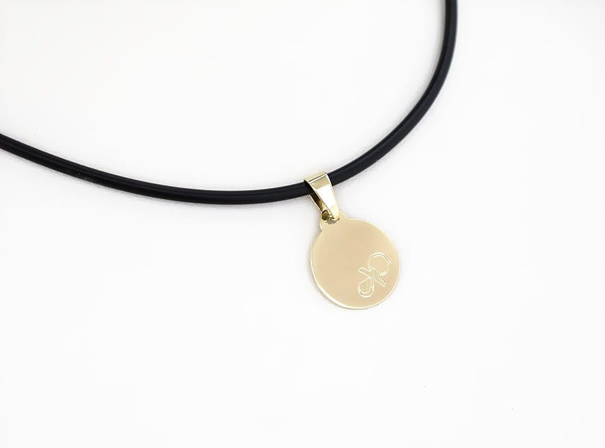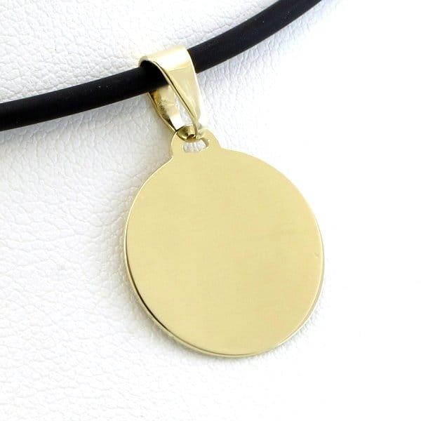 Okrągła przywieszka do łańcuszka, ze złota pr. 585, z trójkątną krawatką. Wykonana w całości ręcznie, w naszej pracowni i cechowana w urzędzie probierczym. Zaletą tej zawieszki jest otworek na krawatkę umieszczony wyżej i w ten sposób zachowujemy pełny okrąg i więcej miejsca na grawerunek. Zawieszka, posiada gładkie, polerowane wykończenie, a przelotka jest na tyle duża, że spokojnie pozwoli na zawieszenie na złotym łańcuszku nawet o grubym splocie. (przykładowy kauczukowy naszyjnik widoczny na zdjęciach ma średnicę 2 mm).