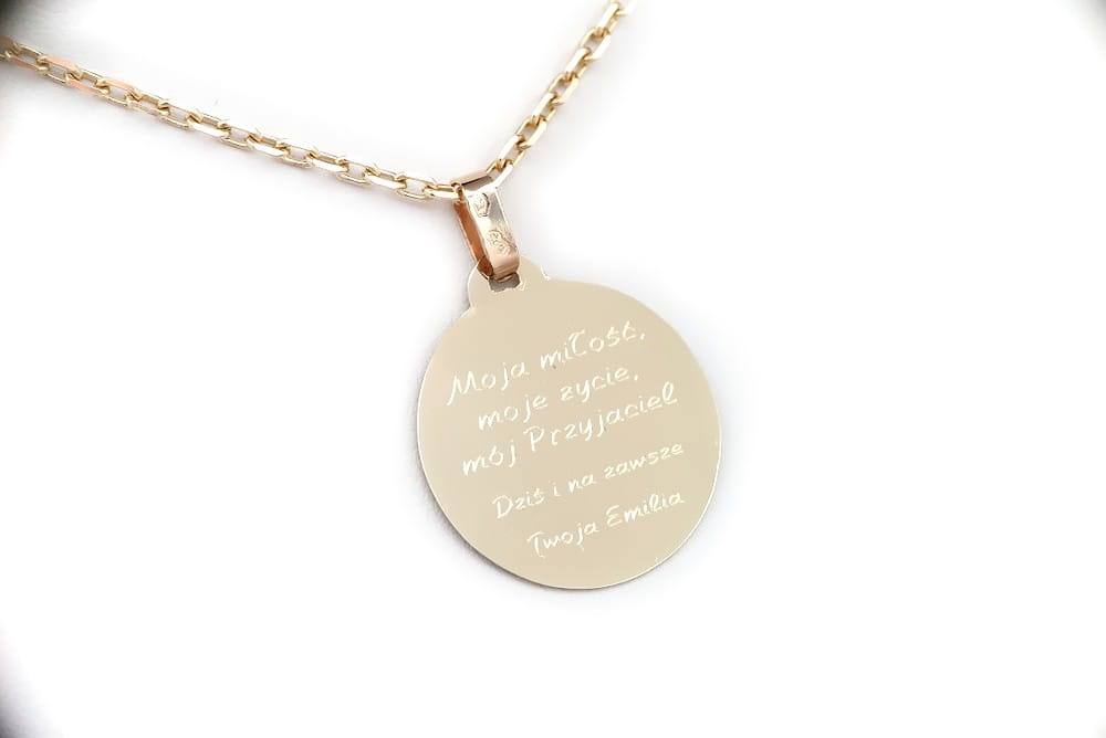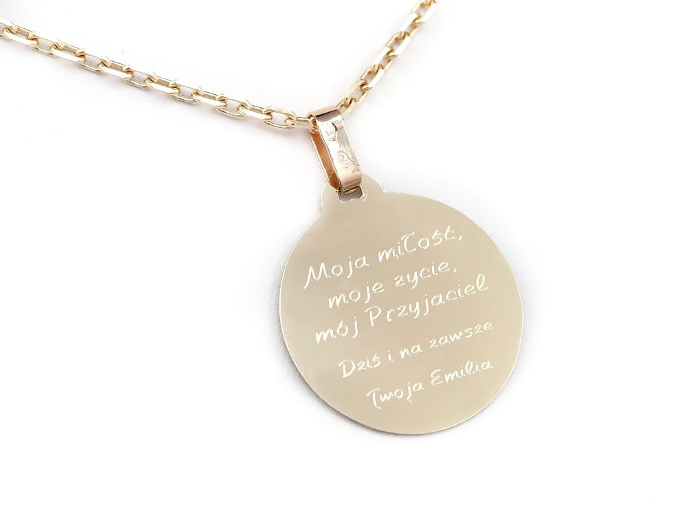 Złota zawieszka średnicy 20mm w formie pełnego okręgu idealnie dopasowanego pod grawerunek w okrągłej formie. Całość wykonana jest z żółtego złota pr 585. Na obu stronach wykonaliśmy grawerunek zgodnie z życzniem klienki. Do kompletu możemy dopasować niezależnie kauczkowy naszyjnik lub złoty łańcuszek. Na pozostałych zdjęciach widać przykładowe połączenie z ankierem.