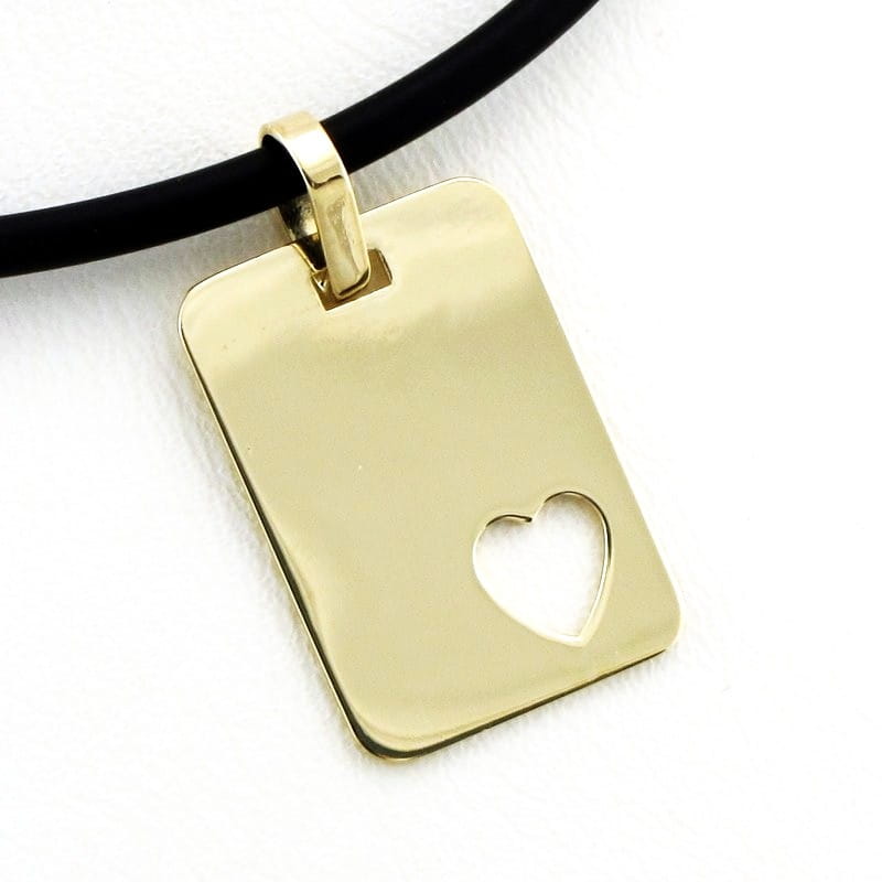 Gładka zawieszka do łańcuszka, w kształcie prostokątnej blaszki z zaokrąglonymi brzegami, z wyciętym wzorem serduszka w dolnym narożniku.Wykonana została ze złota pr. 585, w całości ręcznie w naszej pracowni złotniczej. Przelotka pozwala na zawieszenie złotej blaszki na każdym łańcuszku o niewielkim splocie do średnicy około 3 mm. (przykładowy kauczukowy naszyjnik widoczny na zdjęciach ma średnicę 2 mm). Powierzchnia zawieszki wykończona jest ręcznie na wysoki połysk ale na życzenie, powierzchnia może zostać pokryta satynową fakturą lub ozdobnym grawerunkiem. Klasyczny, prostokątny kształ i subtelny symbol serca sprawia że wisiorek będzie dobrym prezentem zarówno dla kobiety jak i mężczyzny.
