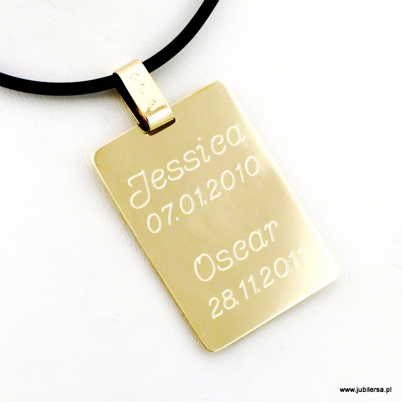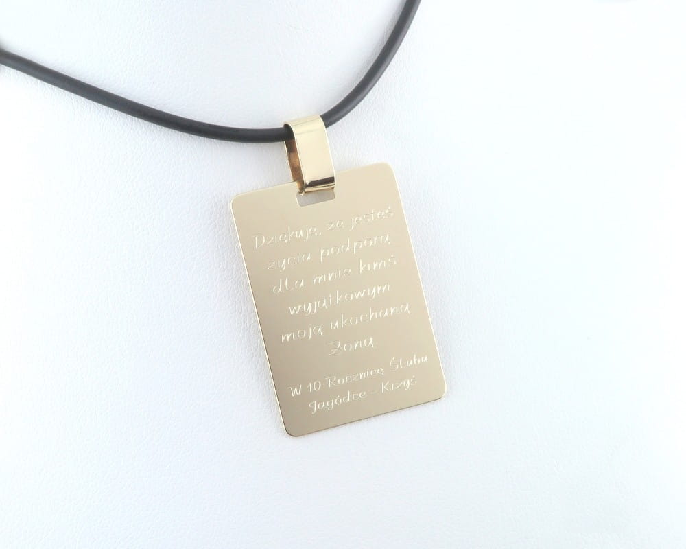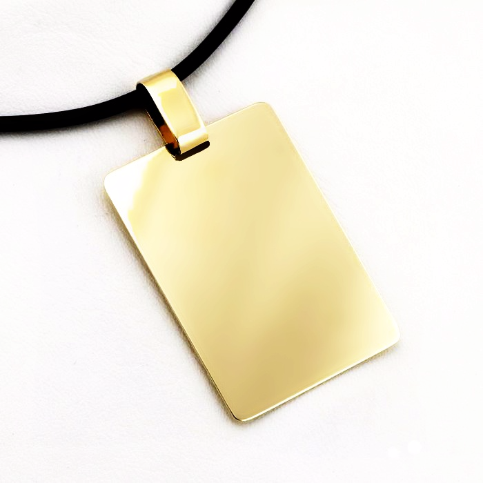 Przywieszka do łańcuszka, ze złota pr. 585 w kształcie prostokąta z zaokrąglonymi rogami, z szeroką masywną krawatką na złoty łańcuszek o szerokim splocie. Wykonana w całości ręcznie, w naszej pracowni i cechowana w urzędzie probierczym. Grubość arkusza 0,50mm (większa niż standardowe 0,37mm) zapewnia sztywność i trwałość. Zawieszka, posiada gładkie, polerowane wykończenie, a przelotka jest na tyle duża, że spokojnie pozwoli na zawieszenie na złotym łańcuszku nawet o grubym splocie. (przykładowy kauczukowy naszyjnik widoczny na zdjęciach ma średnicę 2 mm).