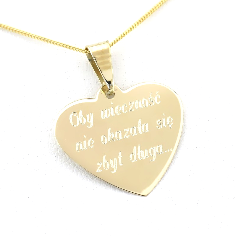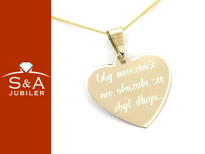 Duża zawieszka do łańcuszka w kształcie symetrycznego serca Wykonana została z żółtego złota pr. 585, w całości ręcznie w naszej pracowni złotniczej. Zawieszka posiada polerowane wykończenie od frontu oraz na odwrocie. Przelotka na łańcuszek jest duża i pozwoli na zawieszenie na złotym łańcuszku o splocie szerokości do 3 mm. (przykładowy kauczukowy naszyjnik widoczny na zdjęciach ma średnicę 2 mm).