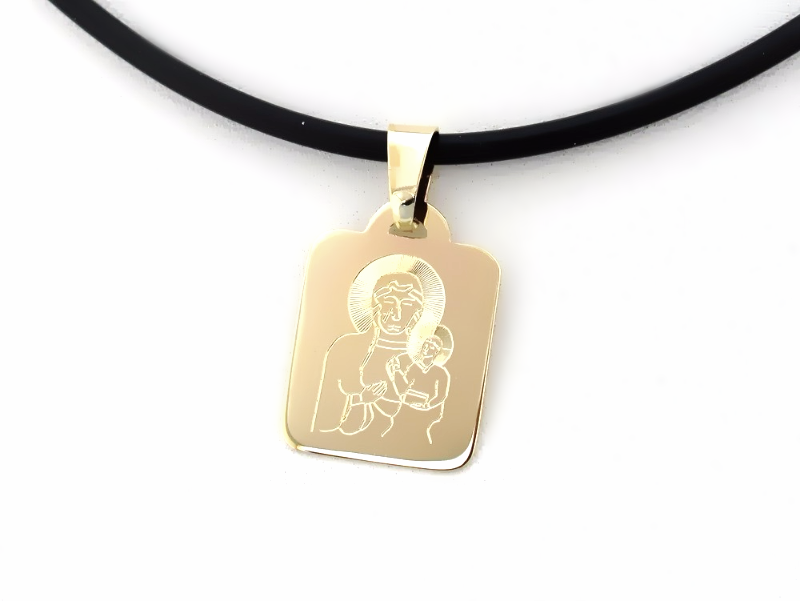 Gładka przewieszka do łańcuszka, w kształcie prostokąta z zaokrąglonymi narożnikami. Wykonana została z żółtego złota pr. 585, w całości w naszej pracowni złotniczej. Duży rozmiar trójkątnej krawatki pozwoli na założenie zawieszki na większość łańcuszków. Przykładowy kauczukowy naszyjnik widoczny na zdjęciach ma średnicę 2 mm. Powierzchnia zawieszki wykończona jest błyszcząca. Na życzenie, powierzchnia może zostać wykończona również na matowo. Klasyczny, prostokątny kształt i jego niewielki rozmiar sprawia, że wisiorek będzie dobrym prezentem zarówno dla dorosłego mężczyzny jak i chłopca np z okazji Komunii Świętej.