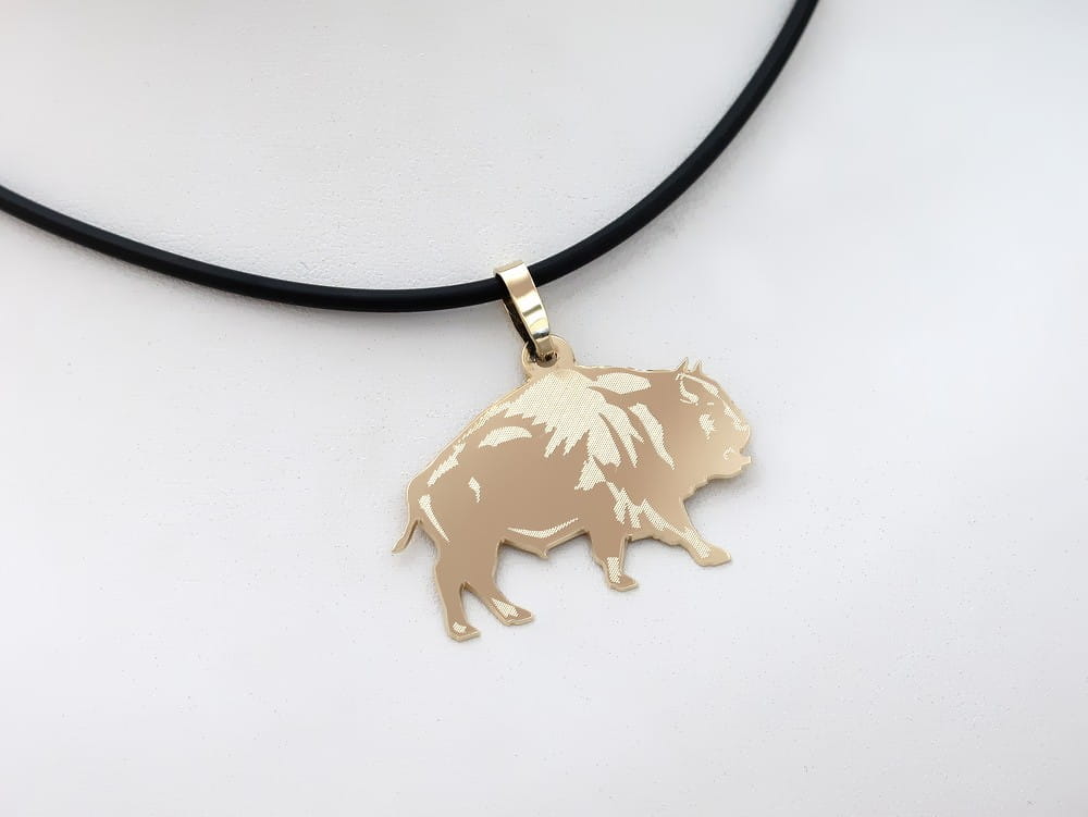 Złota zawieszka w kształcie sylwetki żubra. Cała wykonana z żółtego złota pr. 585. Długość zawieszki to 30mm. Krawatka jest wystarczająco wysoka by zmieścić w sobie łańcuszek o splocie szerokości nawet 7mm. Zawieszka wycięta jest z arkusza złota grubości 0,50mm. Masa zawieszki to około 3,20g. Z przodu błyszczą grawerowane drobniejsze szczegóły sylwetki żubra. Projekt zawieszki wykonaliśmy w oparciu o przykładowy rysunek przesłany przez klientkę.