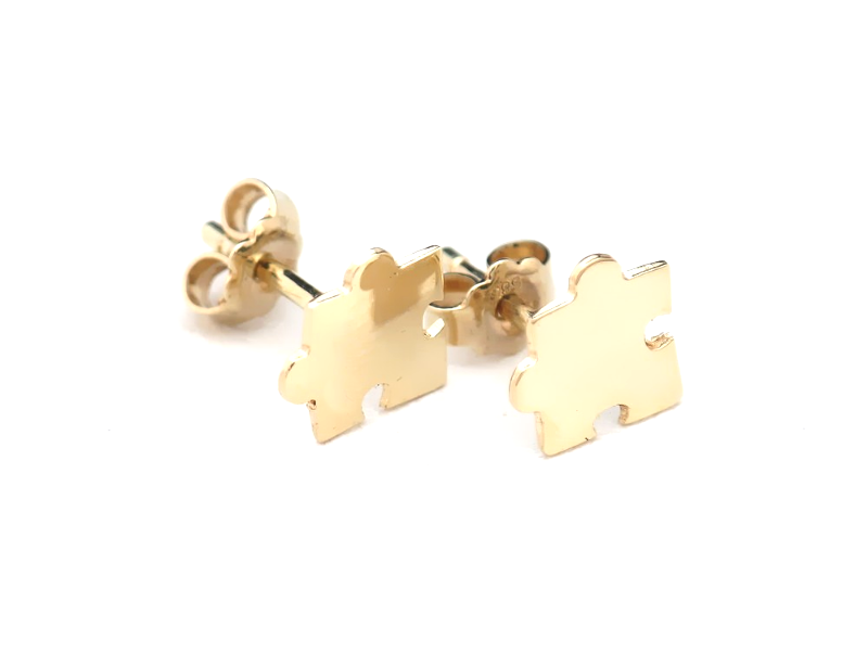 To dość nietypowy wzór kolczyków z całej kolekcji "celebrytek". Małe, płaskie puzelki, przylegające do ucha, na krótkim sztyfcie. Wymiary samej płytki to około 8x8 mm. Całość z żółtego złota pr. 585. Możemy wykonać podobne kolczyki w innym kształcie / rozmiarze. Te akurat wykonaliśmy na zamówienie klientki w komplecie z większą zawieszką.