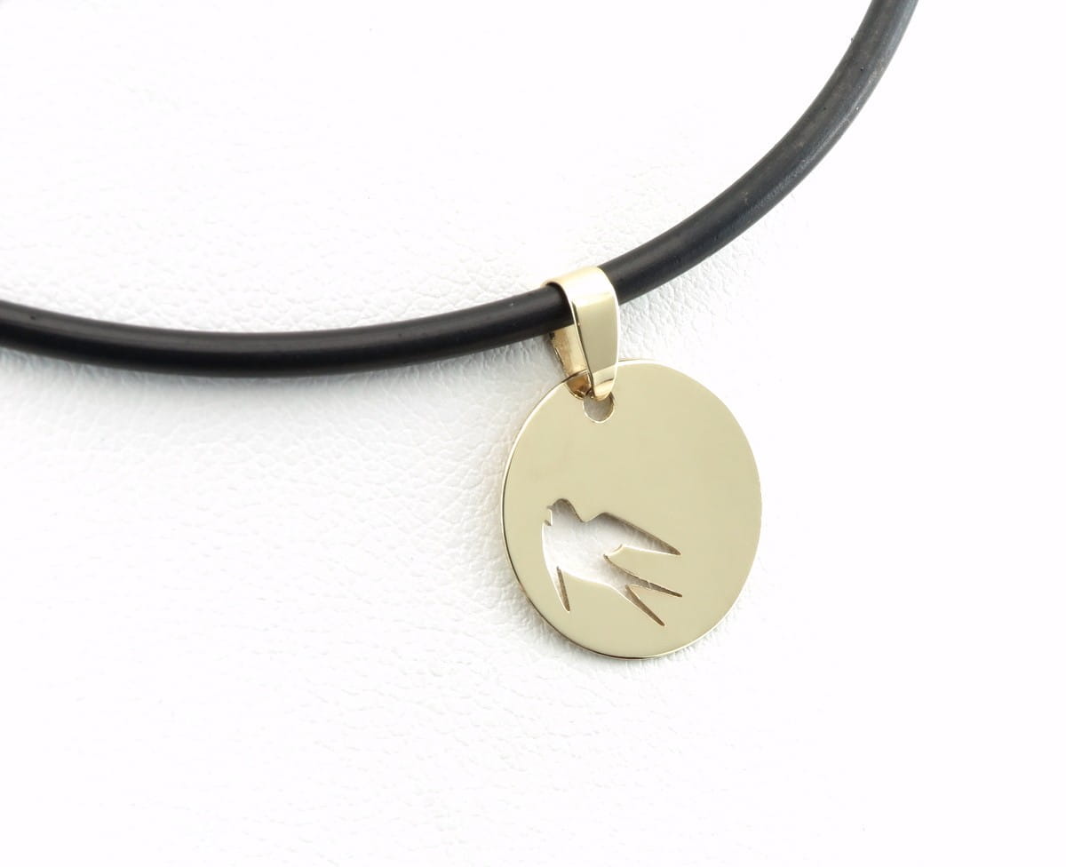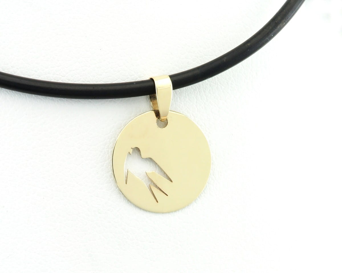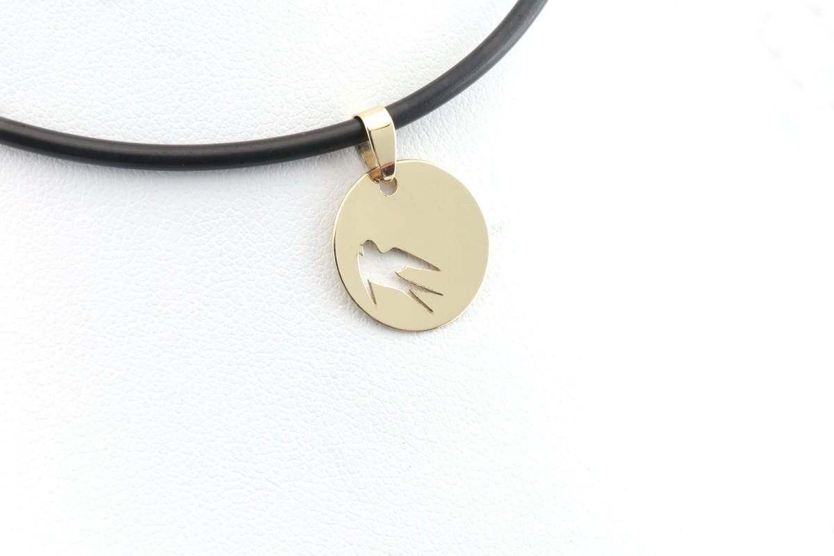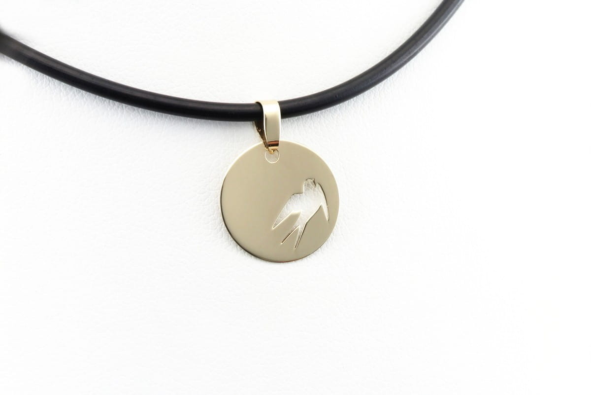 Na życzenie klientki wykonaliśmy złoty krążek z wyciętym motywem jaskółki. Zawieszka została wykonana z żółtego złota w próbie 585, a jaskółka została wycięta laserem przy zachowaniu najdrobniejszych szczegółów. Zawieszka została wypolerowana na wysoki połysk i opatrzona krawatką dopasowaną do łańcuszka właścicielki. Obie strony nadają się pod grawerunek osobistej dedykacji. Jeśli szukają Państwo biżuterii w podobnym stylu , z możliwością spersonalizowana, zapraszamy do kontaktu.