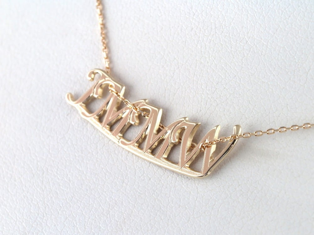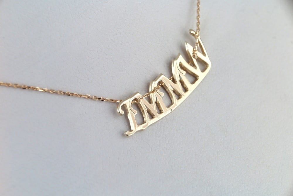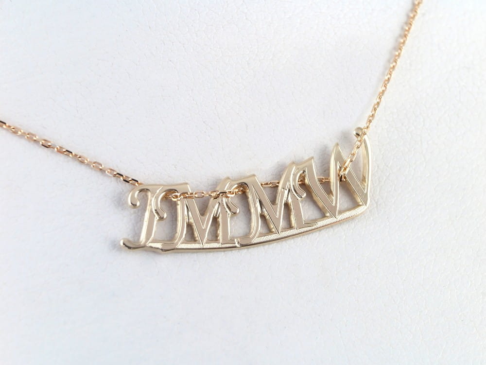 Ten złoty wisiorek wykonaliśmy na życzenie klienta, który szukał właśnie złotego napisu z literek I M M W. Dobraliśmy pasującą czczionkę i wykonaliśmy projekt w skali 1:1. Po akceptacji porojektu wykonaliśmy zawieszkę oraz jej zdjęcia wysłaliśmy do oceny. Koszt takiej biżuterii zależy od ilości materiału ale także od czasochłooności projektu. Przy drobniejszych napisach, takich jak ten, dobrze jest wzmocnić naszyjnik dodając kreseczkę pod napisem. W ten sposób unikamy drobnych wystających elementów które mogą łatwo zahaczyć o ubranie. Do tak wykonanych zawieszek pomożemy dobrać drobny łańcuszek o gładkim splocie, który łatwo pozwoli się przepleść. Podana cena nie obejmuje łańcuszka widocznego na zdjęciach.