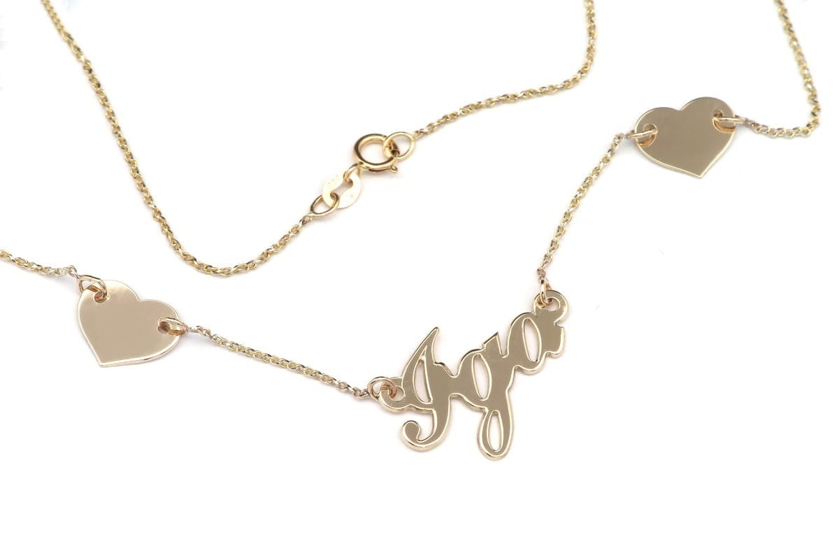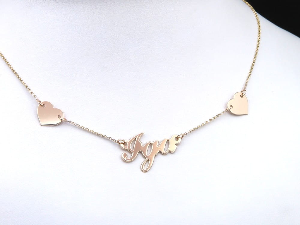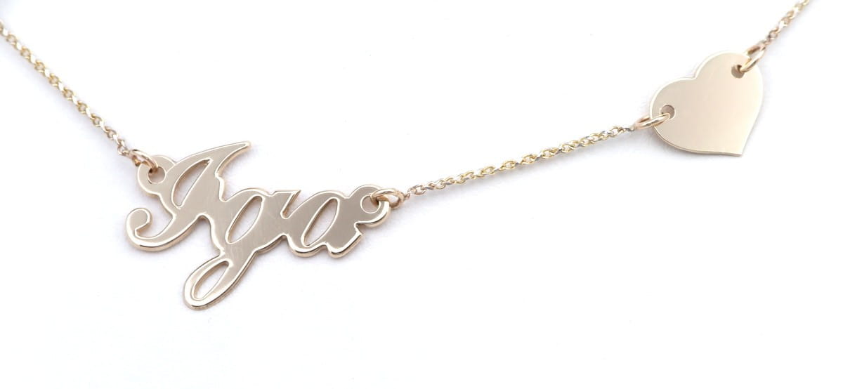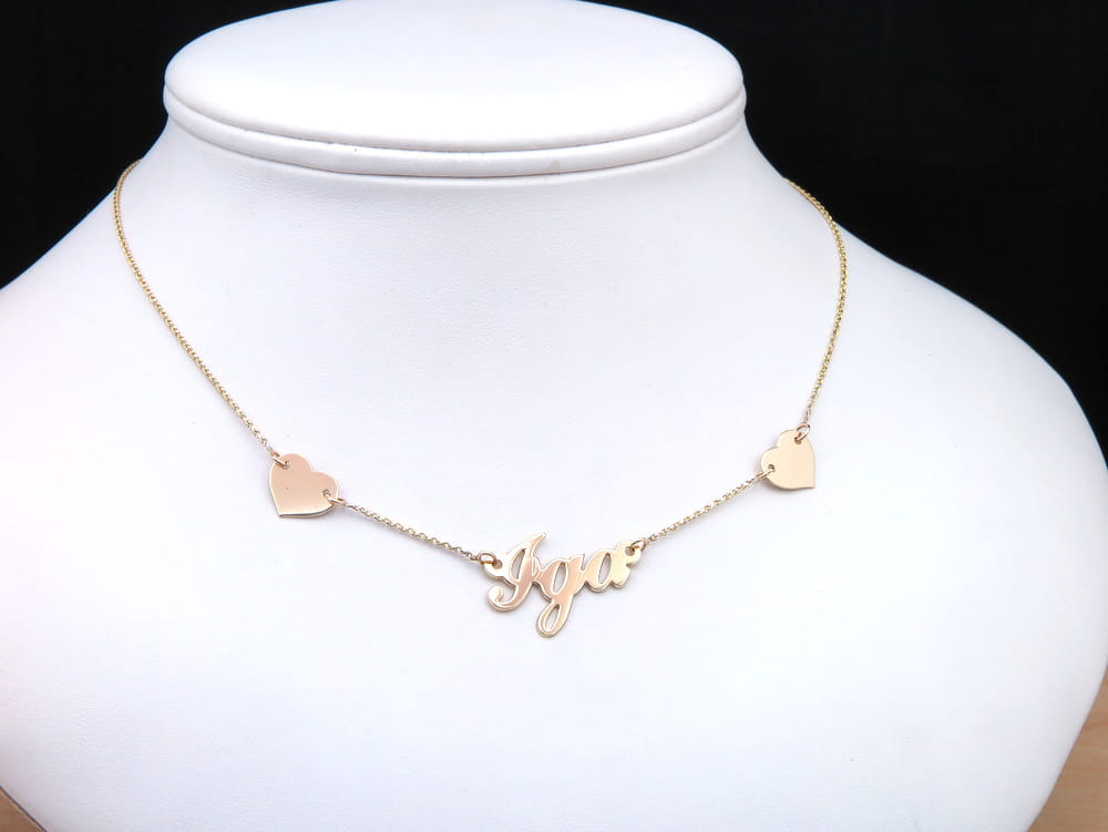 Na życzenie klienta wykonaliśmy naszyjnik z bardzo wdzięcznym imieniem Iga oraz dwoma serduszkami. Całość przygotowana jest ze sztywnej blaszki o próbie 585. Napis Iga wykonany jest pismem w stylu vintage, co przywodzi na myśl bilbordy z lat 70, umiejscowiony na środku naszyjnika w akompaniamencie dwóch serduszek stanowi niepowtarzalny dla oka widok. Bazą dla naszyjnika jest dwukolorowy łancuszek o splocie brilantatta.