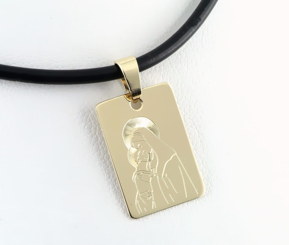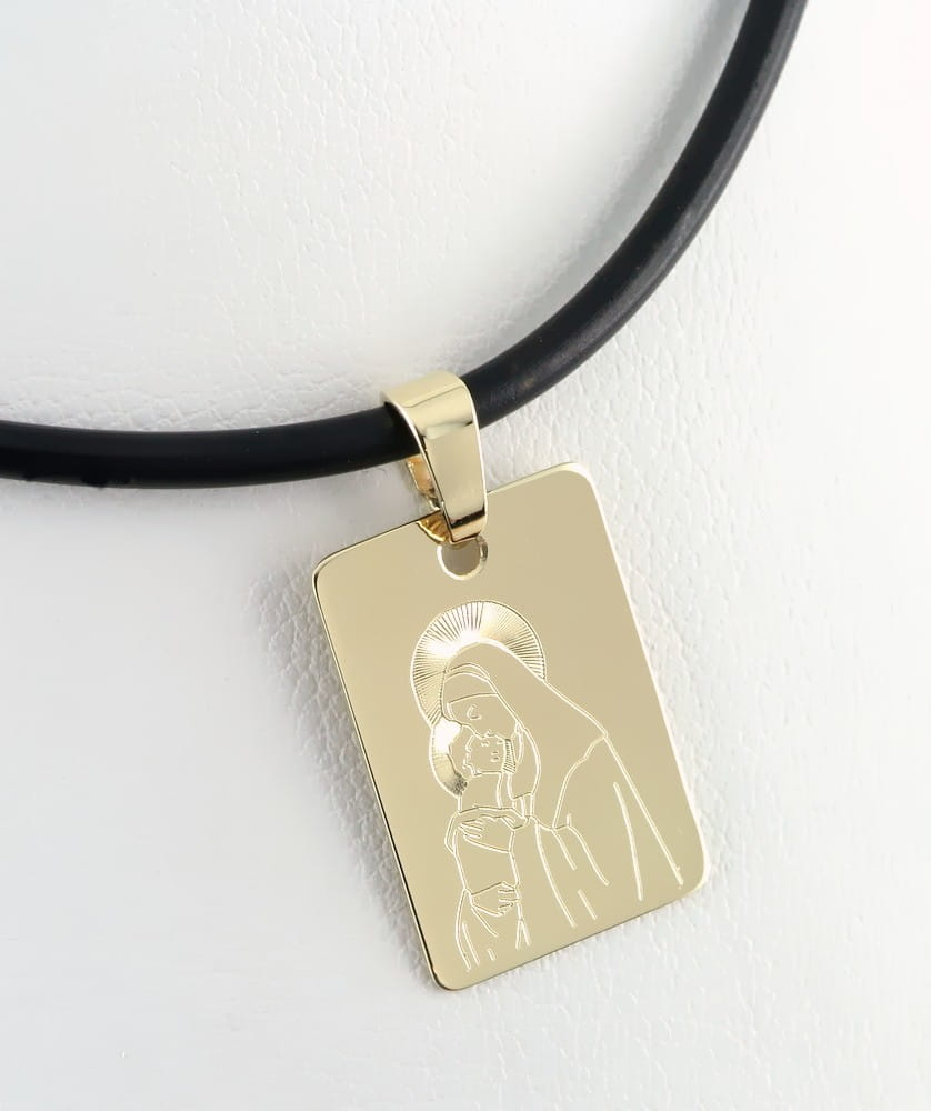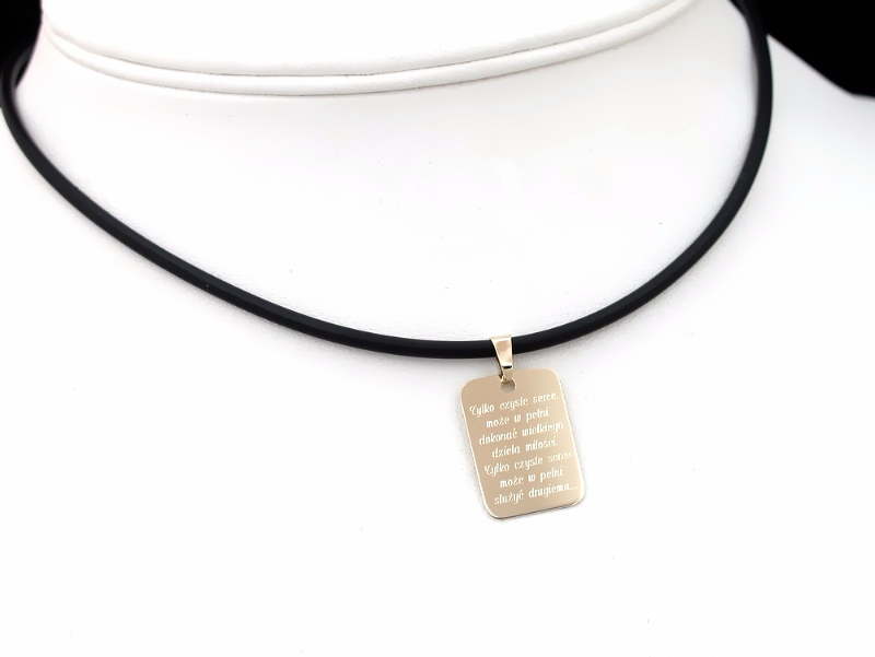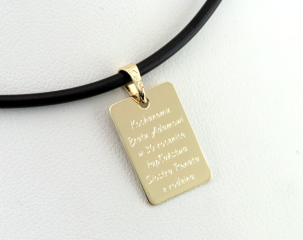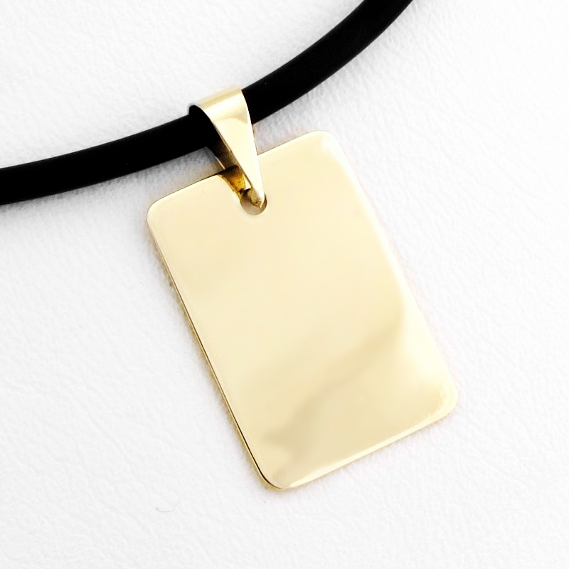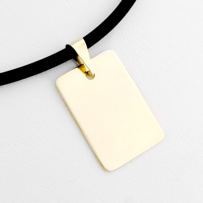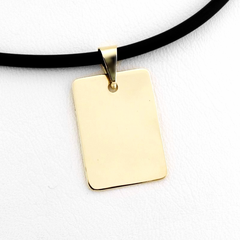 Gładka zawieszka do łańcuszka, w kształcie prostokątnej blaszki z zaokrąglonymi narożnikami. Wykonana została ze złota pr. 585, w całości ręcznie w naszej pracowni złotniczej. Trójkątna przelotka pozwala na zawieszenie złotej blaszki na prawie każdym łańcuszku o niewielkim splocie do średnicy około 2,5 mm. (przykładowy kauczukowy naszyjnik widoczny na zdjęciach ma średnicę 2 mm). Powierzchnia zawieszki wykończona jest ręcznie na wysoki połysk, ale na życzenie, powierzchnia może zostać pokryta satynową fakturą lub ozdobnym grawerunkiem.Klasyczny, prostokątny kształ i jego niewielki rozmiar sprawia, że wisiorek będzie dobrym prezentem zarówno dla dorosłego mężczyzny jak i chłopaka.