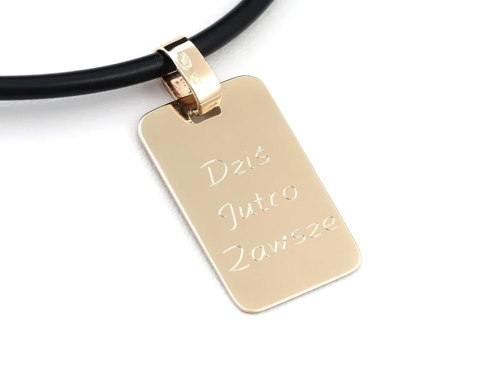 Na życzenie klientki wykonaliśmy nieduży nieśmiertelnik ze złotej blachy o grubości 0,4 mm co nada zawieszce odpowiednią sztywności i trwałość. Cały produkt ma wymiary 20 na 13 minimetrów. Dzięki niewielkim wymiarom będzie stanowić idealny prezent na pierwszą komunię lub dyskretną męską biżuterię.
