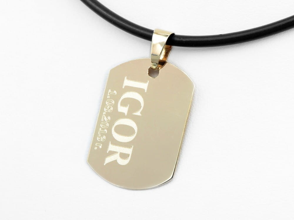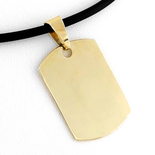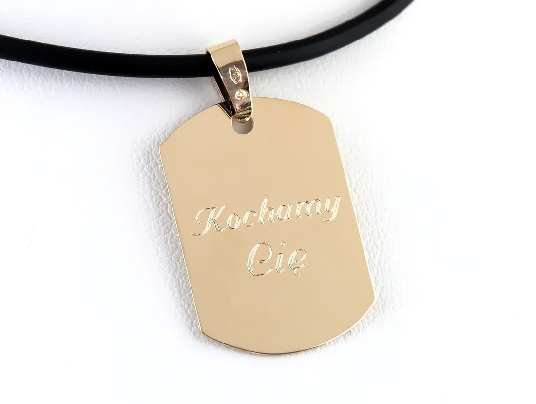 Przywieszka do łańcuszka, ze złota pr. 585 w kształcie "nieśmiertelnika". Wykonana w całości ręcznie, w naszej pracowni i cechowana w urzędzie probierczym. Zawieszka, posiada gładkie, polerowane wykończenie, a przelotka jest na tyle duża, że spokojnie pozwoli na zawieszenie na złotym łańcuszku nawet o grubym splocie. (przykładowy kauczukowy naszyjnik widoczny na zdjęciach ma średnicę 2 mm).
