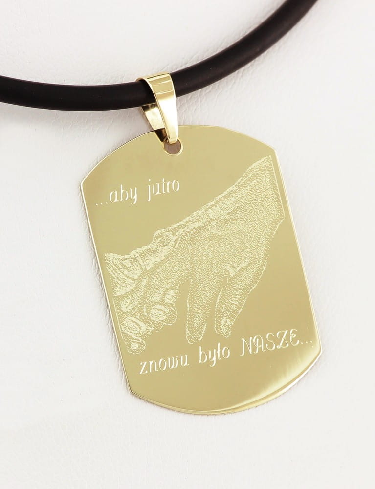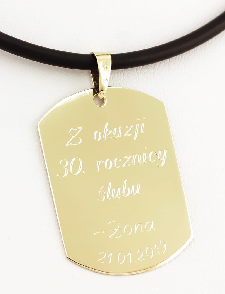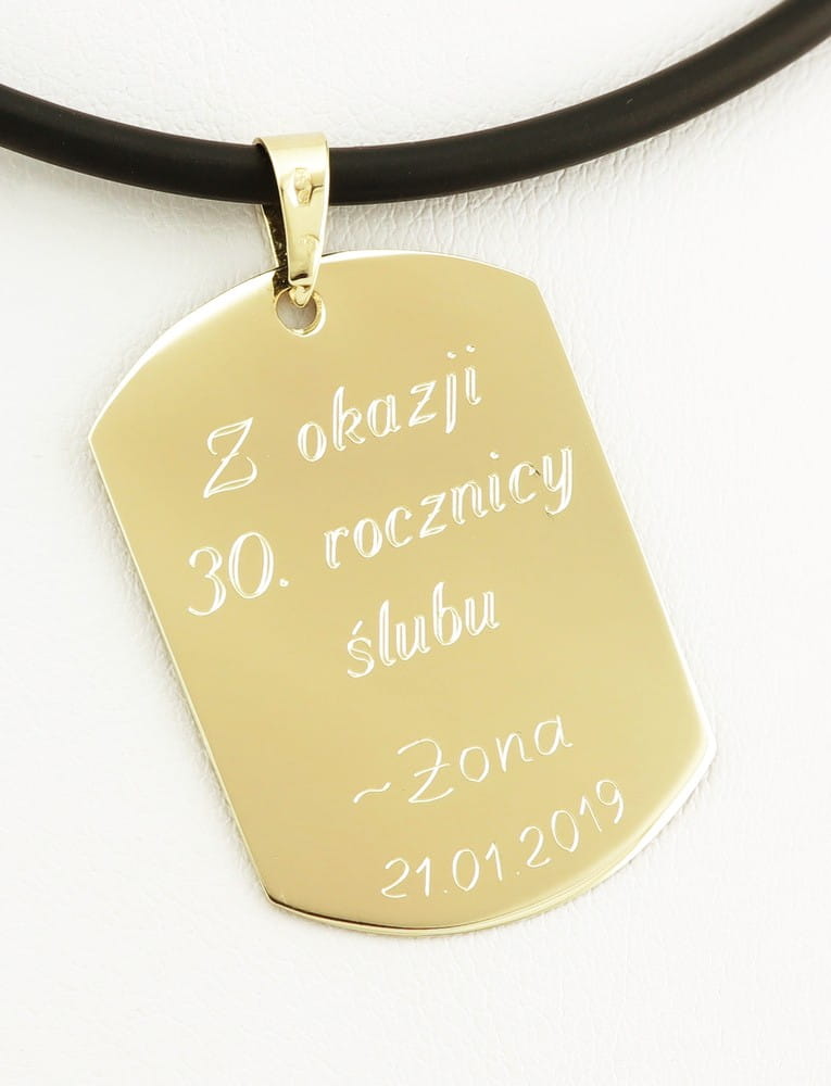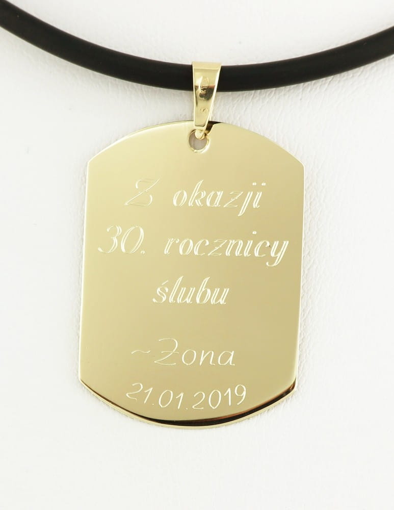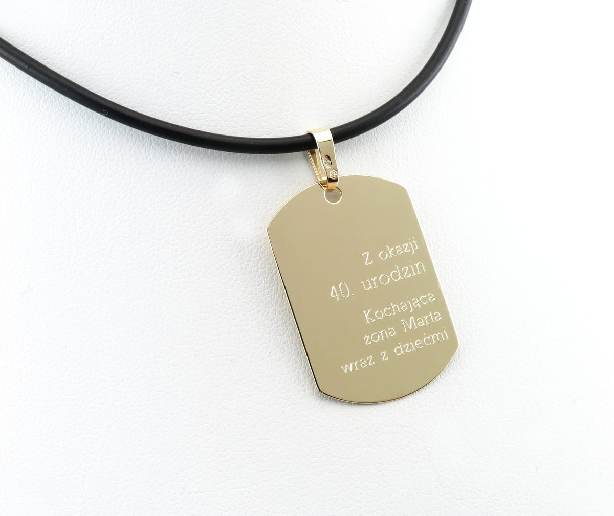Przywieszka do łańcuszka, ze złota pr. 585 w kształcie "nieśmiertelnika". Wykonana w całości ręcznie, w naszej pracowni i cechowana w urzędzie probierczym. Zawieszka, posiada gładkie, polerowane wykończenie, a przelotka jest na tyle duża, że spokojnie pozwoli na zawieszenie na złotym łańcuszku nawet o grubym splocie. (przykładowy kauczukowy naszyjnik widoczny na zdjęciach ma średnicę 2 mm).