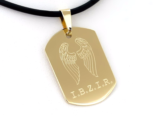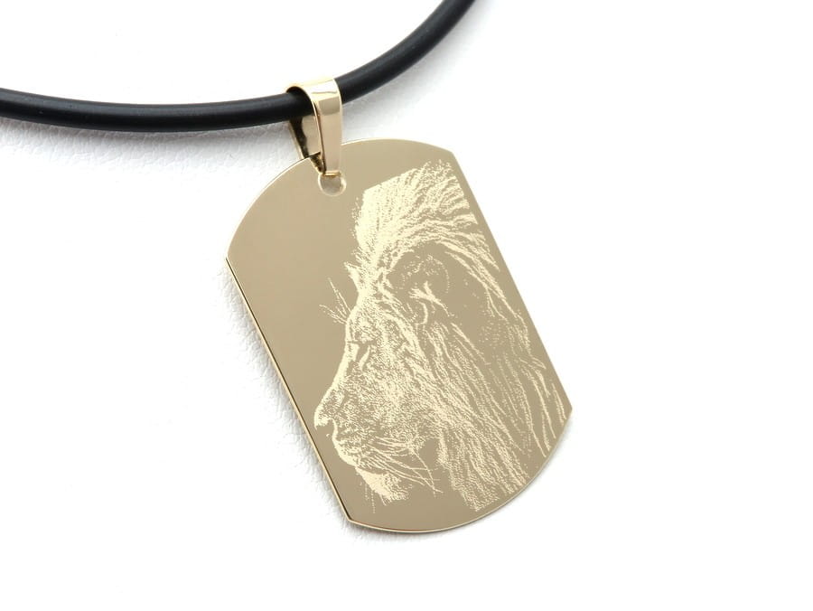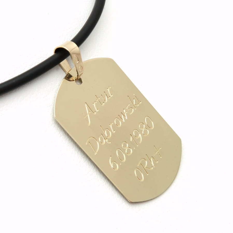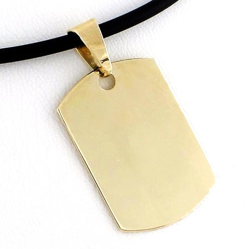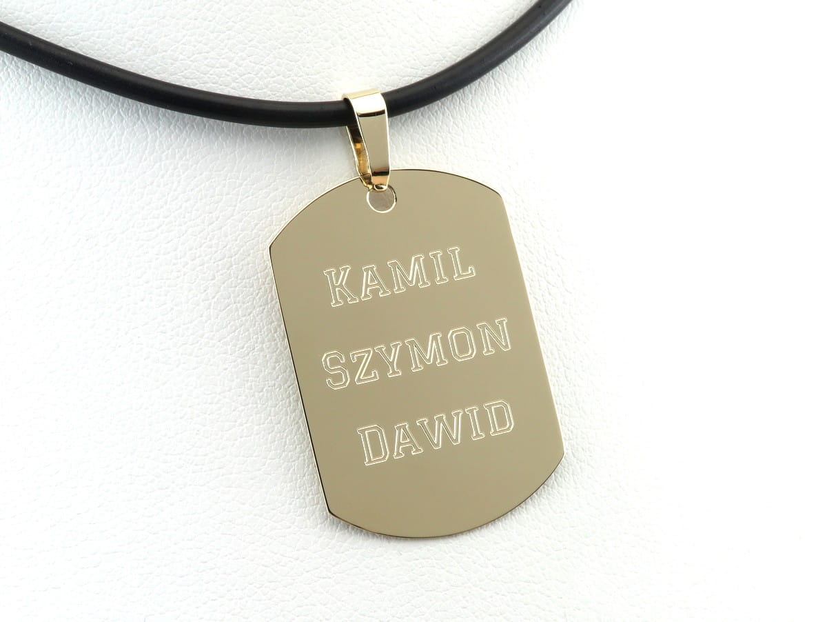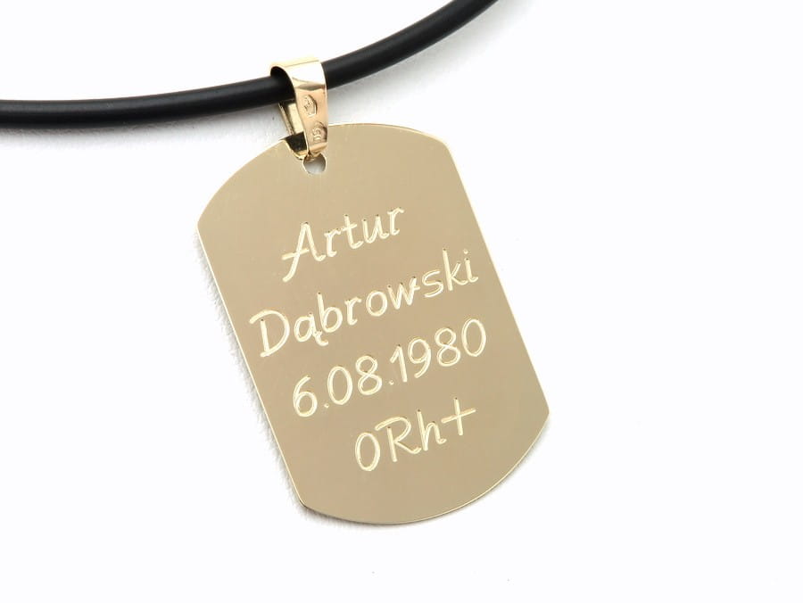 Przywieszka do łańcuszka, ze złota pr. 585 w kształcie "nieśmiertelnika". Wykonana w całości ręcznie, w naszej pracowni i cechowana w urzędzie probierczym. Zawieszka, posiada gładkie, polerowane wykończenie, a przelotka jest na tyle duża, że spokojnie pozwoli na zawieszenie na złotym łańcuszku nawet o grubym splocie. (przykładowy kauczukowy naszyjnik widoczny na zdjęciach ma średnicę 2 mm).