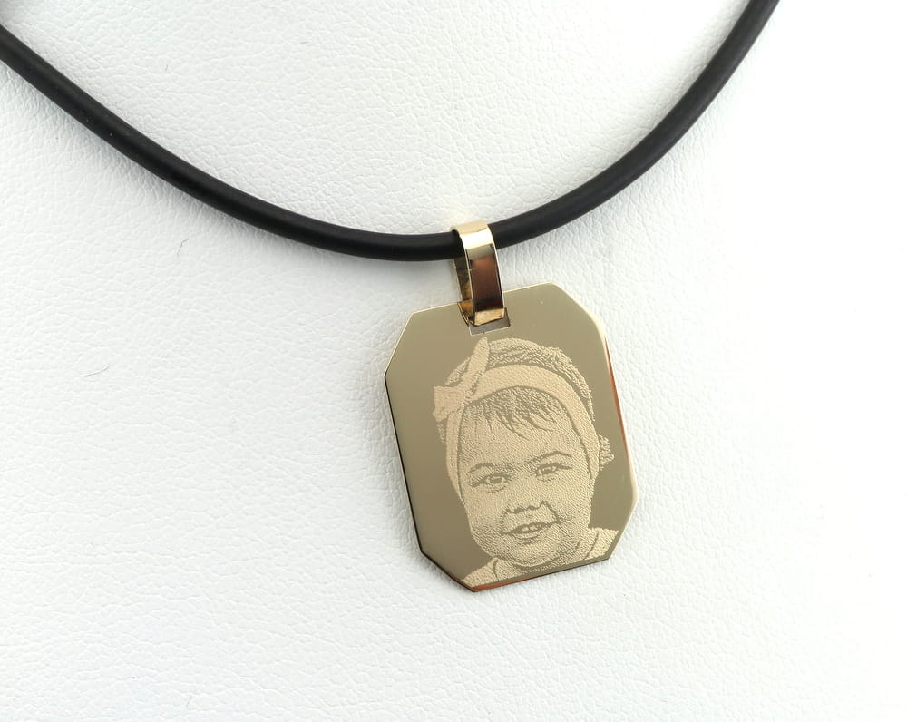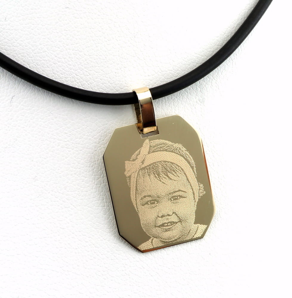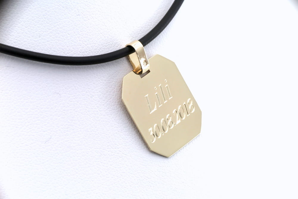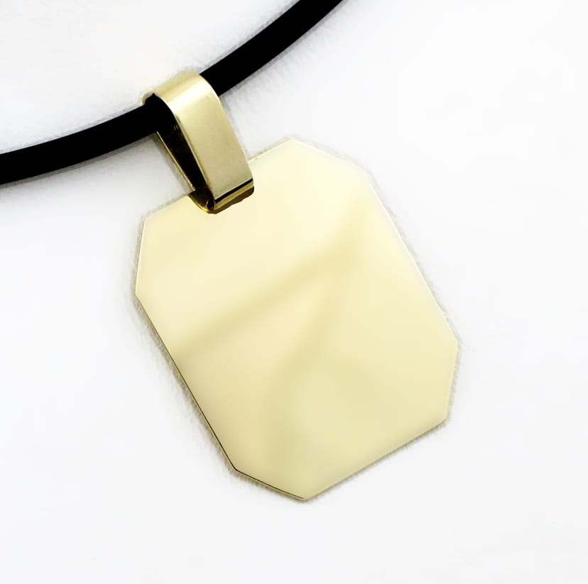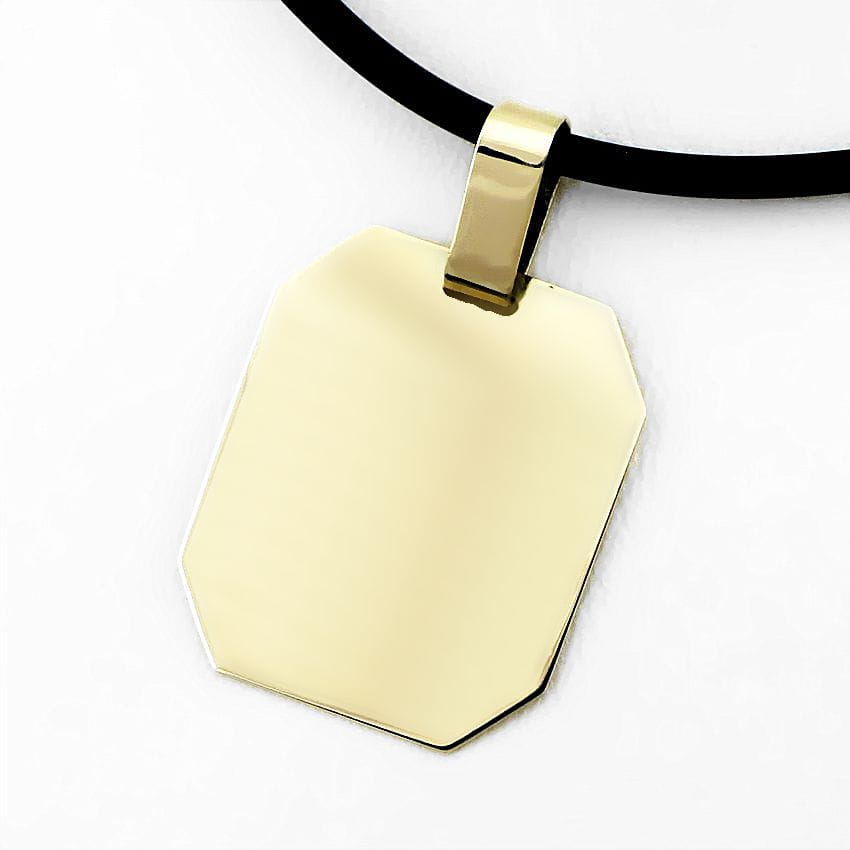 Duża zawieszka do łańcuszka w kształcie prostokąta ze ściętymi narożnikami. Wykonana została z żółtego złota pr. 585, w całości ręcznie w naszej pracowni złotniczej. Zawieszka posiada polerowane wykończenie z obu stron. Przelotka na łańcuszek jest duż i pozwoli na zawieszenie na złotym łańcuszku o splocie szerokości do 6 mm. (przykładowy kauczukowy naszyjnik widoczny na zdjęciach ma średnicę 2 mm).