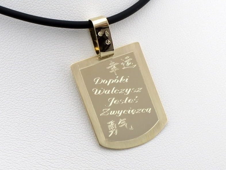 Ten model nieśmiertelnika wykonaliśmy wg przesłanego pomysłu klienta. Kształt przypomiający tarczę, orzeł oraz ramka, która odziela część satynową od błyszczącej. Z przodu satynowa jest część w środku, a na odwrocie satynowa jest ramka. Dedykacja zawiera treść zgodnie z życzeniem i wizją klienta. Jeśli interesuje Państwa podobny formą nieśmiertelnik możemy wykonać go praktycznie dowolnej wielkości i kształcie. Prosimy o kontakt mailowy.