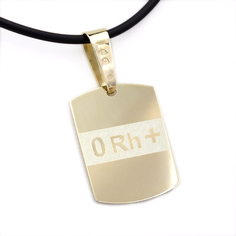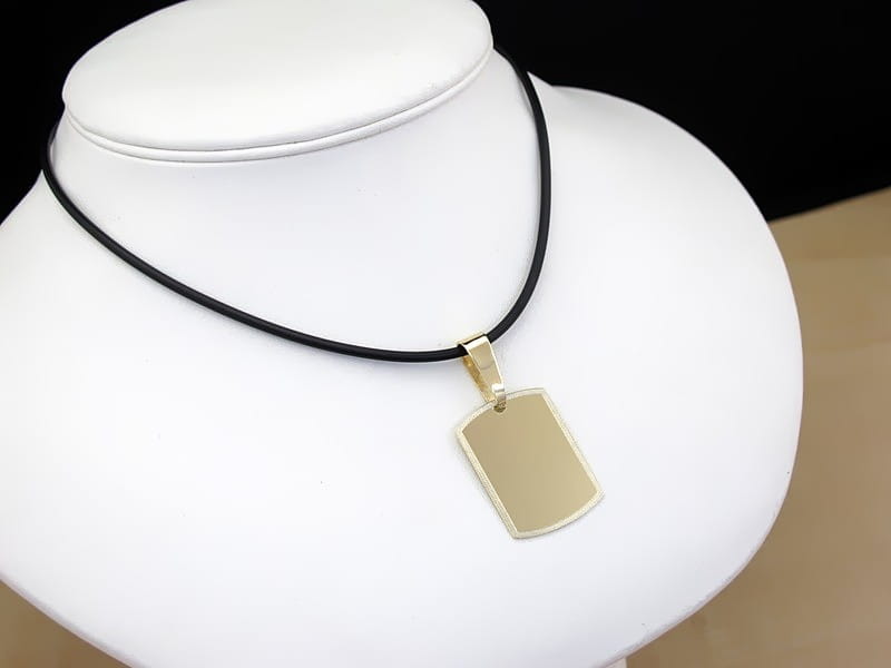 Złoty nieśmiertelnik wykonana z arkusza złota grubości 0,65mm. Wymiary blaszki to 27 x 20 mm ustalone z klientem. Całość w żółtym złocie pr. 585. Trójkątna krawatka dopasowana jest do grubości splotu łańcuszka, który klient posiada. Z obu stron zaprojektowaliśmy i wykonaliśmy grawerunek. Dla przykładu czarny naszyjnik na zdjęciach ma średnicę 2mm