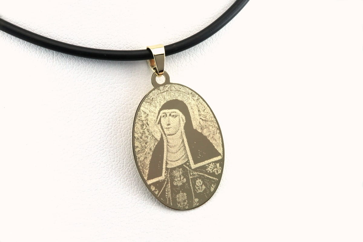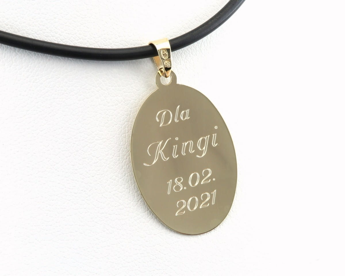 Na życzenie klienta wykonaliśmy owalny medalik z podobizną Św. Kingi. Niewielki owal wykonaliśmy ze złotego arkusza o próbie 585. Na froncie wygrawerowaliśmy podobiznę Świętej, plecy natomiast opatrzono okolicznościową dedykacją. Przelotka dopasowana została tak, aby pasowała do większości standardowych łańcuszków.