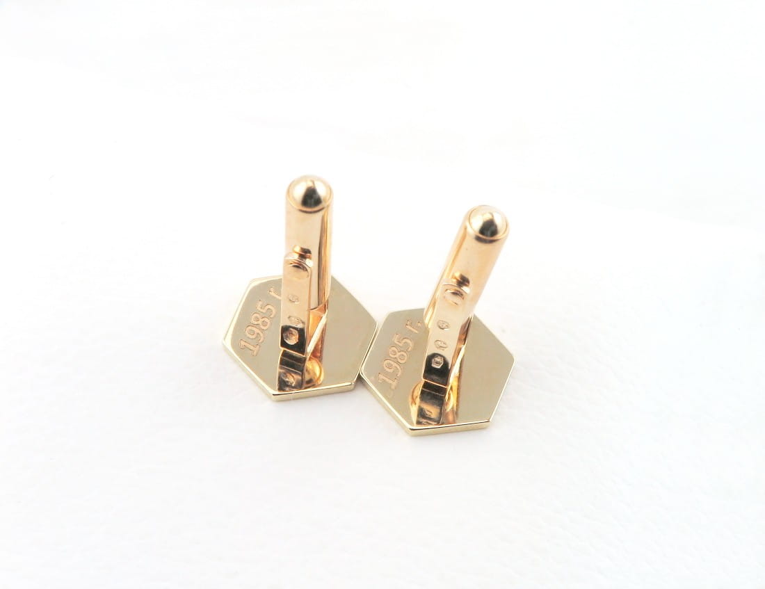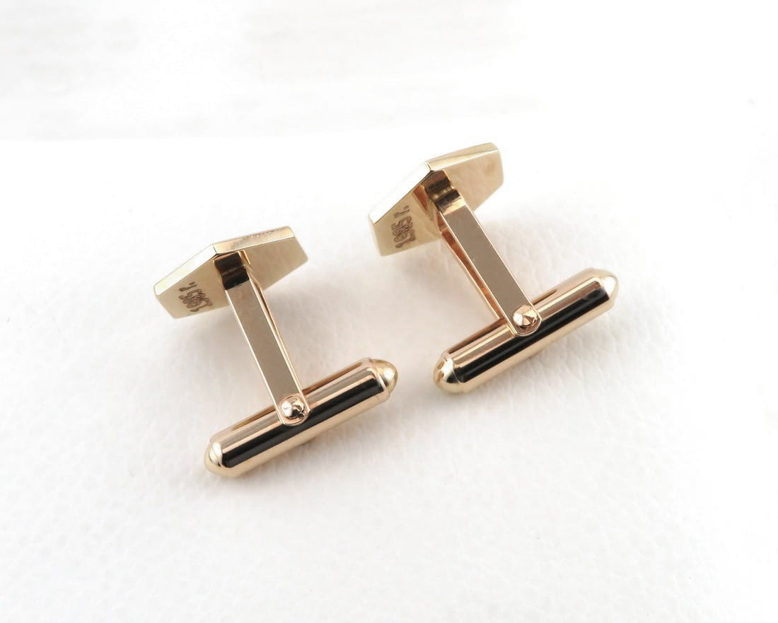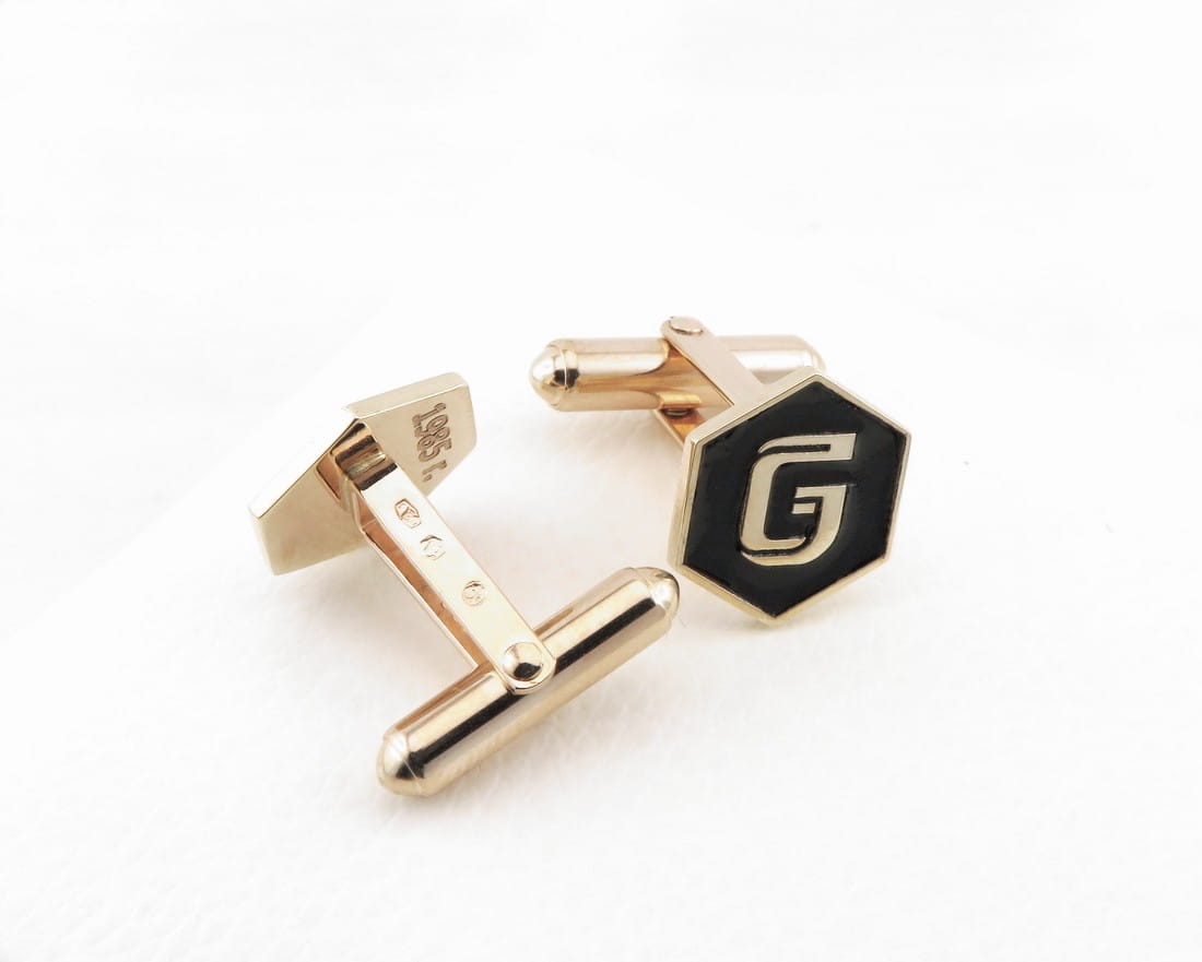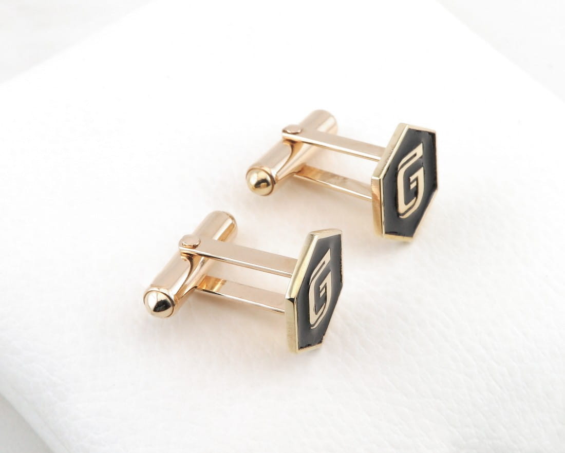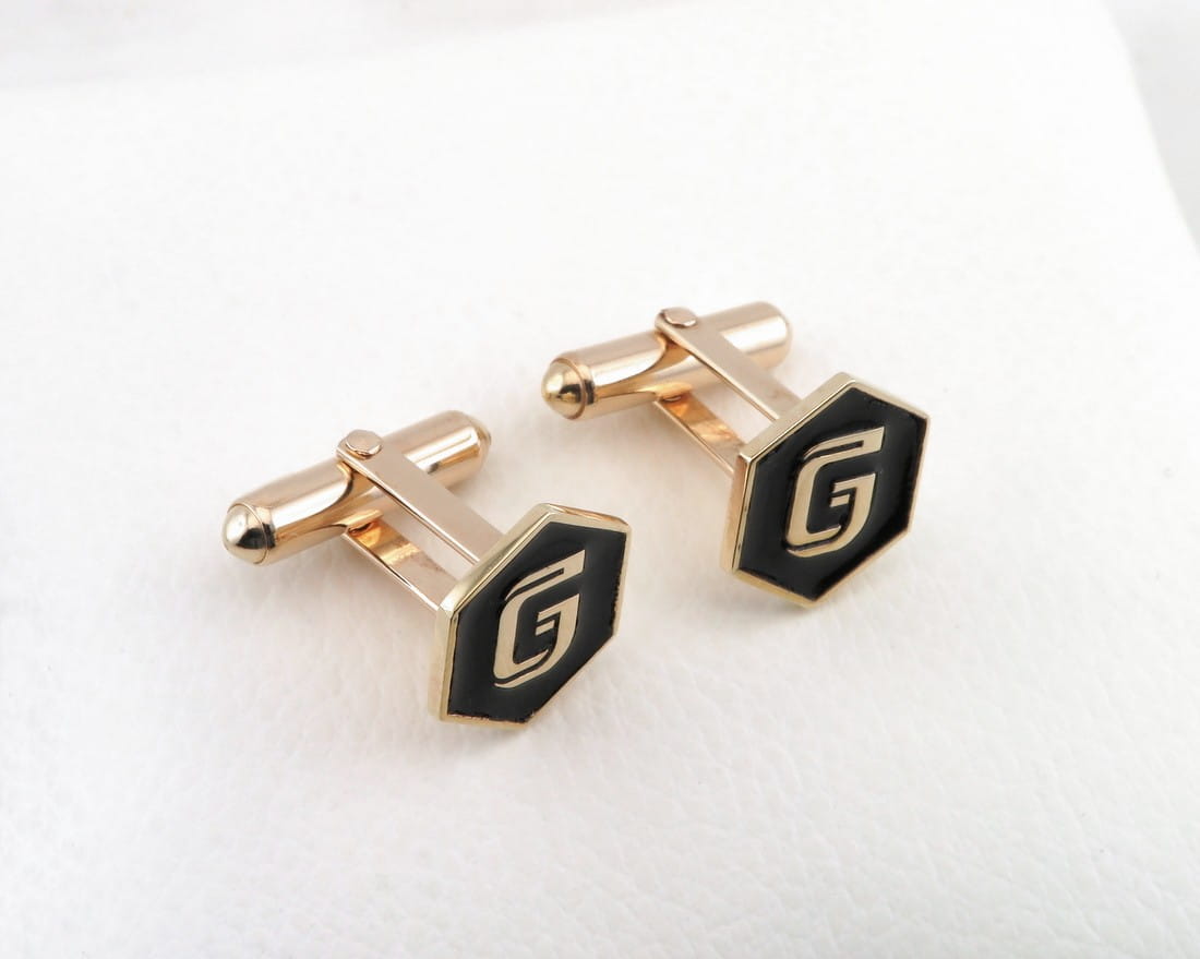 Na zamówienie wykonaliśmy spersonalizowany komplet dodatków do garnituru. Złote spinki do mankietów oraz pin do marynarki zostały zaprojektowane wzoru logo klienta i po ustaleniu wszystkich szczegółów przystąpiliśmy do pracy. Z materiału w próbie 585 wycięliśmy ozdobne kształty i zamocowaliśmy je odpowiednio na szpilce oraz złotych mechanizmach mankietowych. Całość została utwardzona a następnie wypolerowana na wysoki połysk. Kolejnym krokiem było wykonanie okolicznościowego grawerunku, a zwieńczeniem pracy nałożenie czarnej połyskującej emalii. Komplet ten stanowi bardzo elegancki, spersonalizowany zestaw dodatków do formalnego, jak i bardziej casualowego stroju. Jeśli mają Państwo pomysł na wykonanie w tej formie spersonalizowanych spinek lub wpinki, zapraszamy do kontaktu.