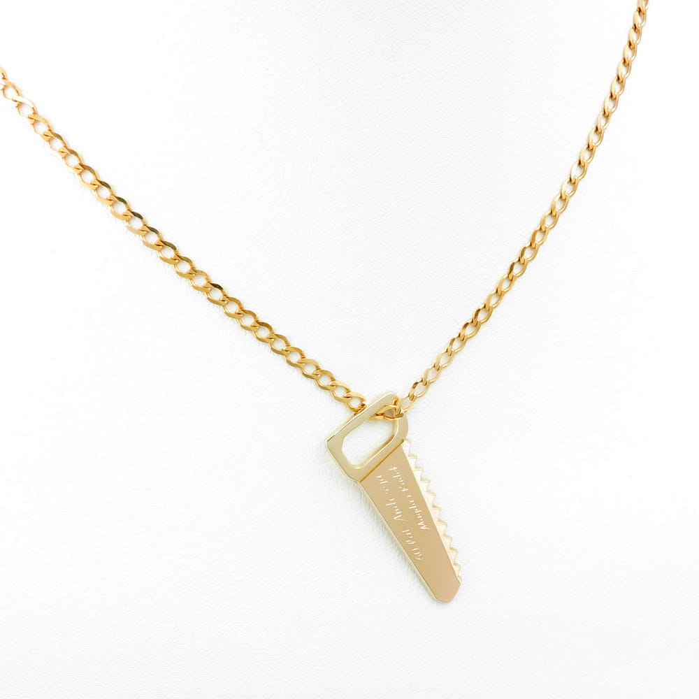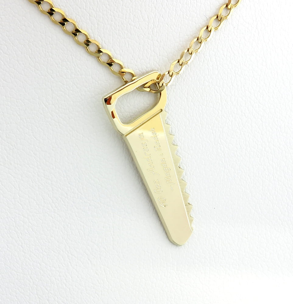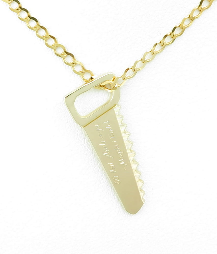 Zgodnie z przesłanym pomysłem klienta, wykonaliśmy zawieszkę w kształcie ręcznej piły. Całość w złocie próby 585. Wymiary to 27 × 10 mm całość wycięta z grubego sztywnego materiału. Robocza część piły została wygrawerowana, cały wisior wykończono na wysoki połysk. Na froncie widnieje dedykacja okolicznościowa. Produkt z pewnością ucieszy każdego stolarza, majsterkowicza lub drwala.