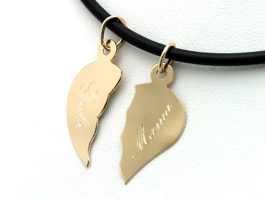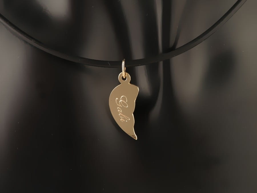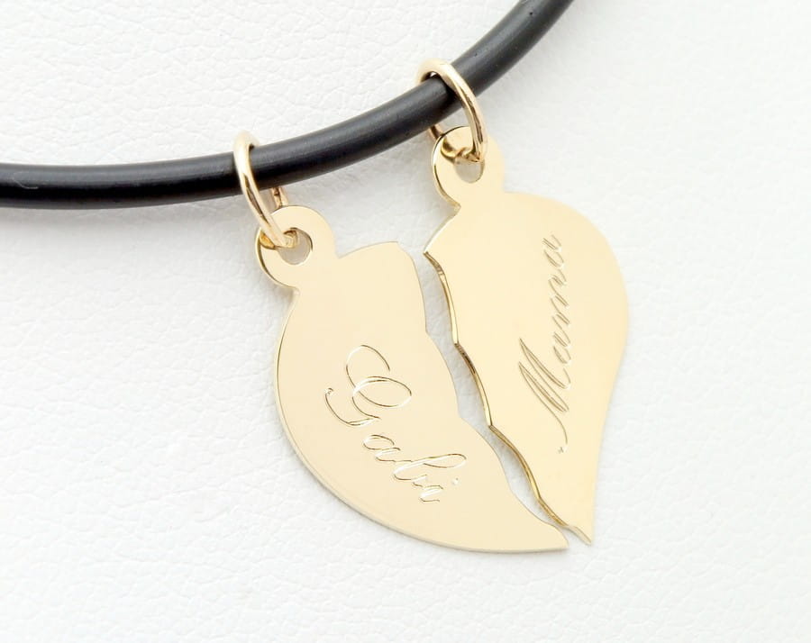 (przykładowy kauczukowy naszyjnik widoczny na zdjęciach ma średnicę 2 mm). Powierzchnia zawieszki wykończona jest na wysoki połysk, ale na życzenie, powierzchnia może zostać pokryta satynową fakturą lub ozdobnym grawerunkiem. Prosty kształt i forma sprawia, że wisiorek nadaje się szczególne dla pary zakochanych, gdyż na połówkach serca można wygrawerować ich imiona. Na życzenie możemy przełamać serduszko oraz wygładzić i wypolerować ostre krawędzie.