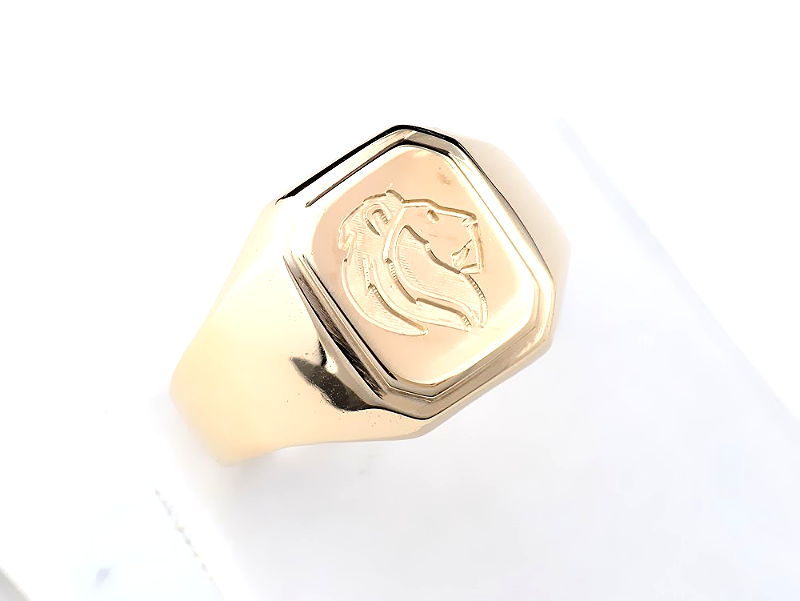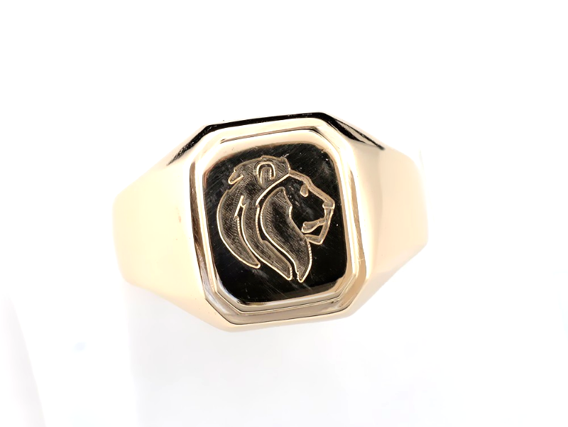 Złoty sygnet z grawerem głowy lwa