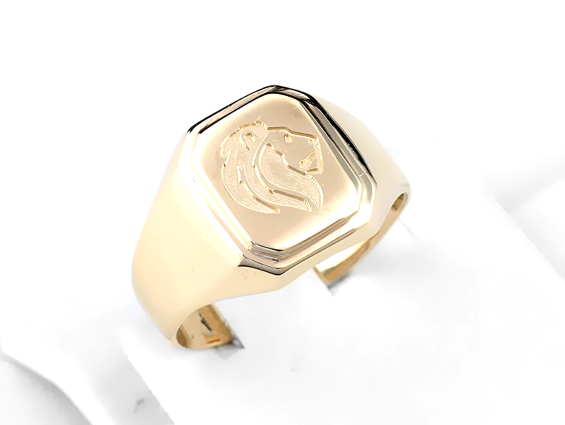 Oto złoty sygnet z grawerunkiem głowy lwa. Sam sygnet to jeden modeli z dostępnych w kategorii złoto. Grawerunek wykonany jest frezem, jest głęboki i bardzo trwały, nie ma możliwość by się wytarł w przeciwieństwie do grawerunku diamentem. Projekt ustaliliśmy z klientem, a rozmiar sygnetu dopasowaliśmy do palca. Grawerujemy też na powierzonych sygnetach, a przed każdą pracą wykonujemy projekt do akceptacji. Na naszych sygnetach grawerek wykonamy gratis. Na powierzonych przedmiotach grawerunek wyceniany jest indywidualnie.